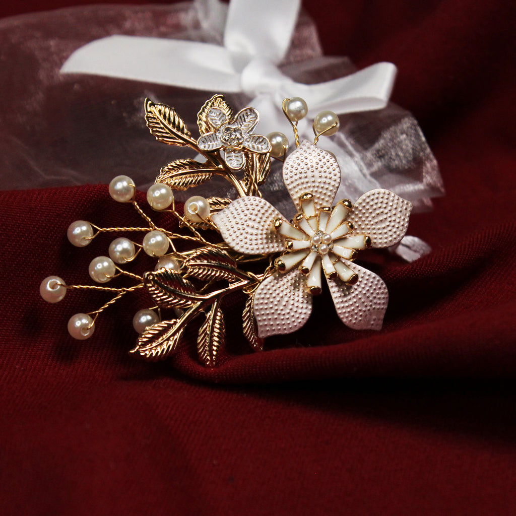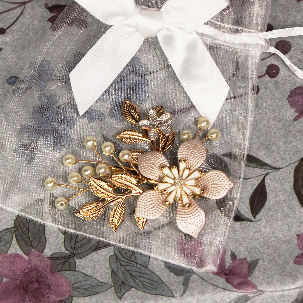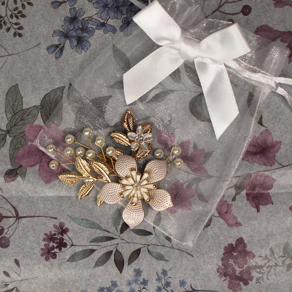 Velmi elegantní slitinové květy do vlasů na skřipci s třpytivým efektem a perličkami. Tato okrasná spona do vlasů se hodí k výjimečným událostem jako je věneček, promoce nebo svatba. Součást balení je organzový sáček s mašlí.