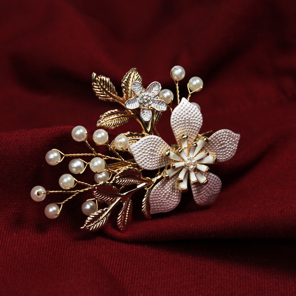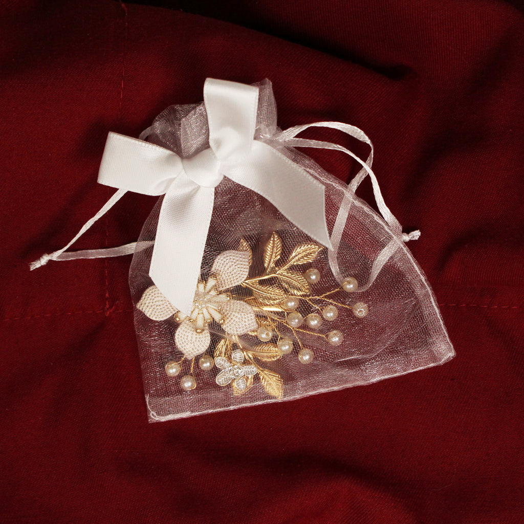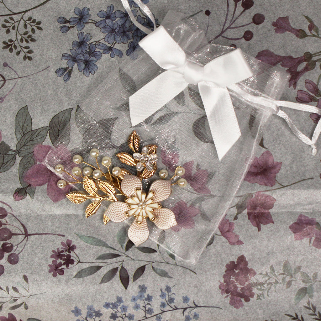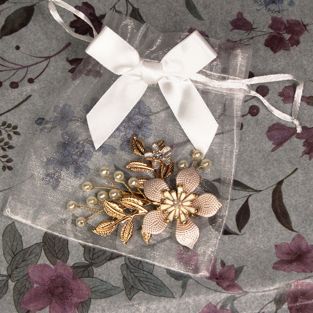 Velmi elegantní slitinové květy do vlasů na skřipci s třpytivým efektem a perličkami. Tato okrasná spona do vlasů se hodí k výjimečným událostem jako je věneček, promoce nebo svatba. Součást balení je organzový sáček s mašlí.