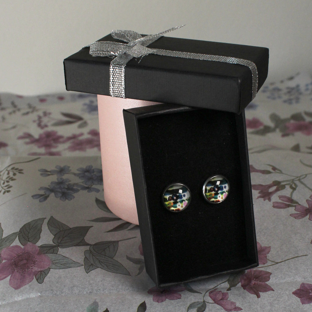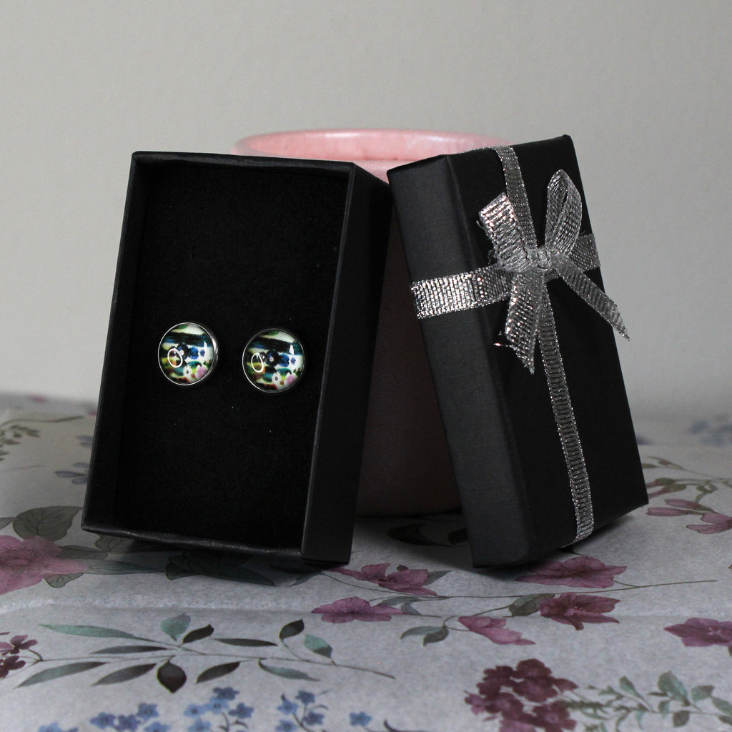 Hypoalergenní knoflíkové naušnice s květinovým vzorem. Tyto nevšední naušnice, na první pohled zaujmou a potěší jako dárek pro každou příležitost. Samozřejmostí je dárkové balení včetně elegantní černé krabičky s mašlí.
