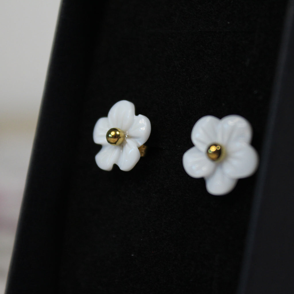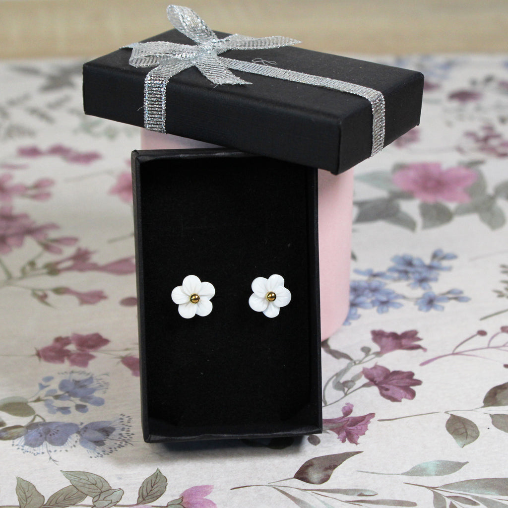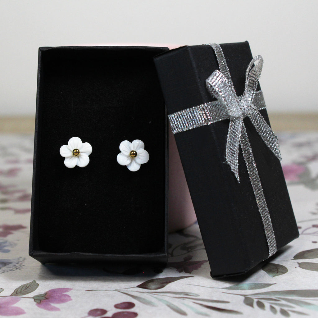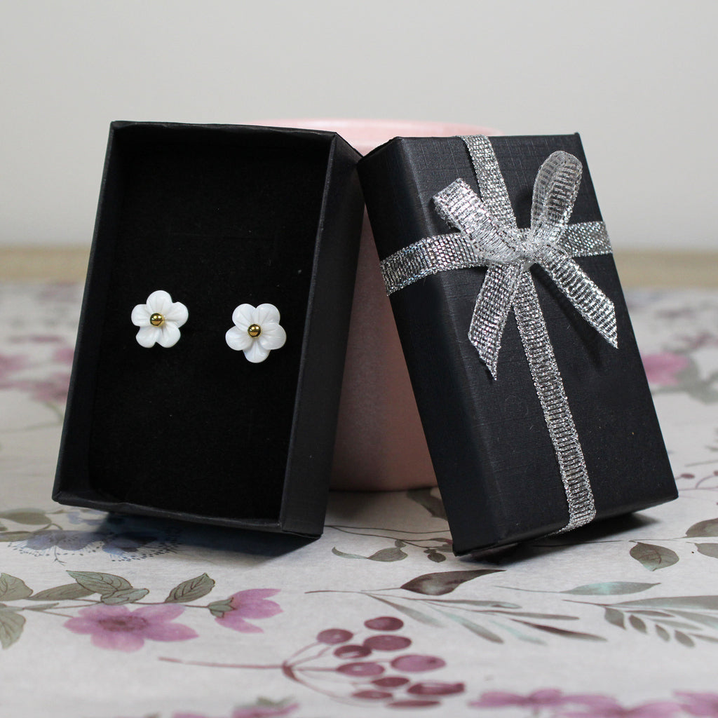 Nerezové hypoalergenní naušnice ve tvaru bílých květů. Tyto nevšední náušnice, jsou velmi jemné a decentní. Potěší jako dárek pro každou příležitost. Samozřejmostí je dárkové balení včetně elegantní černé krabičky s mašlí.