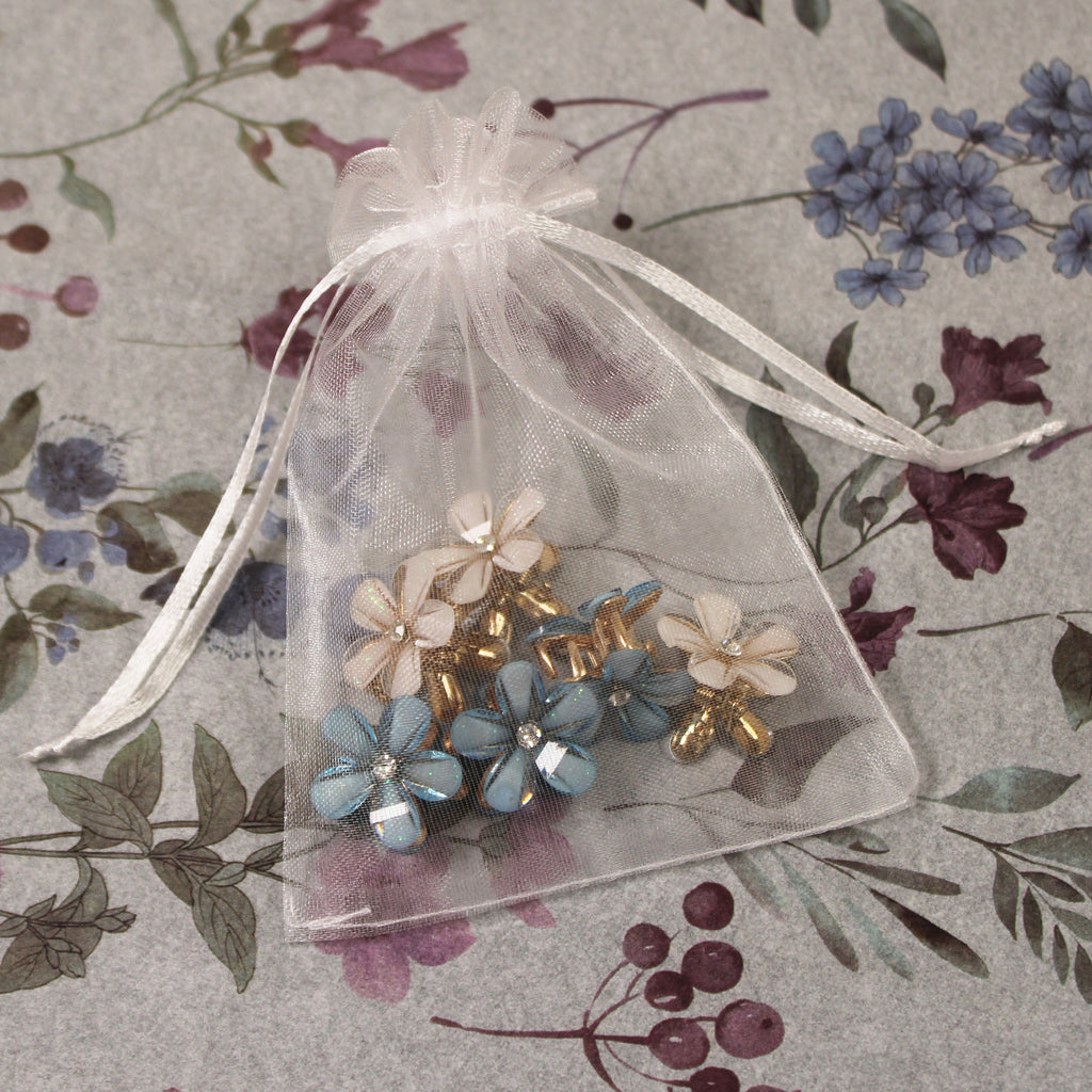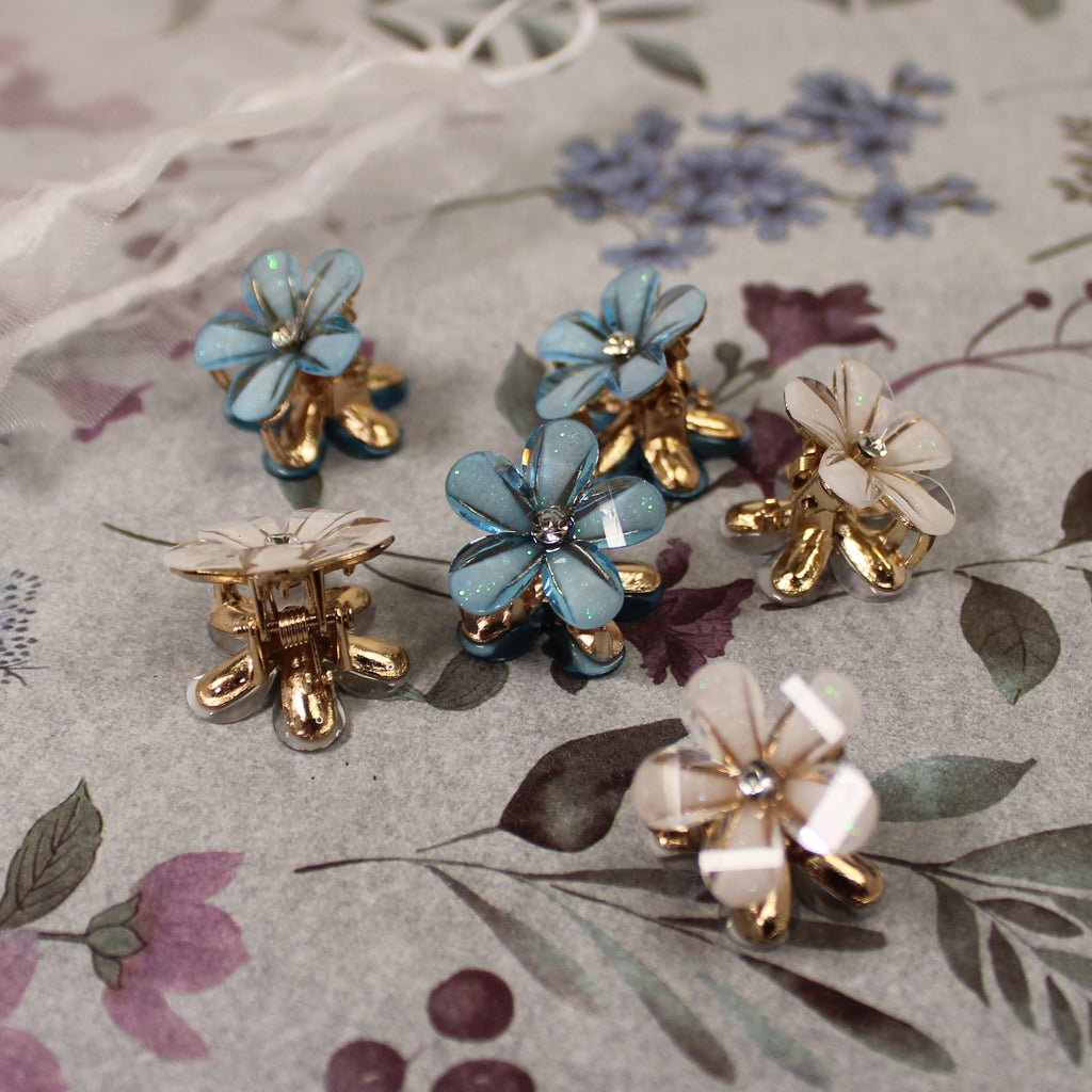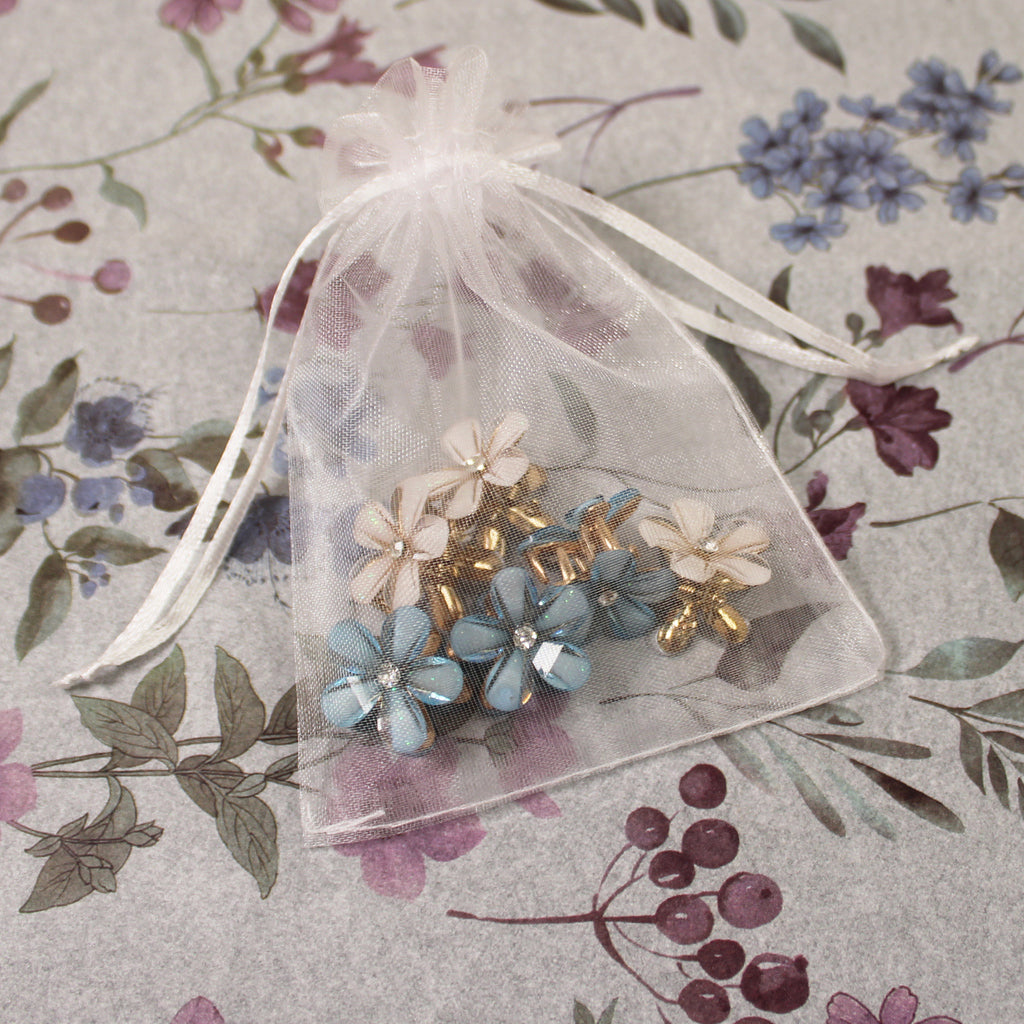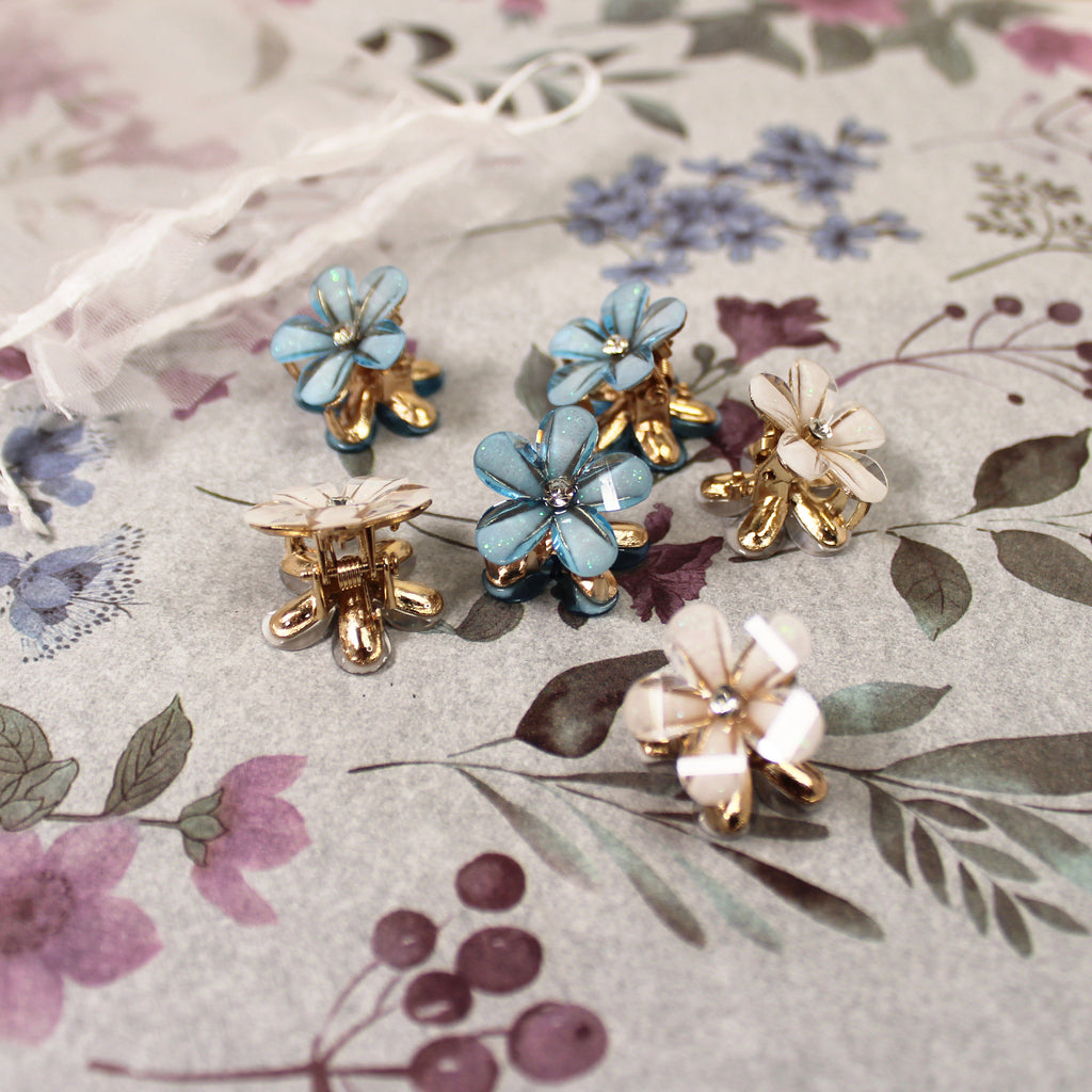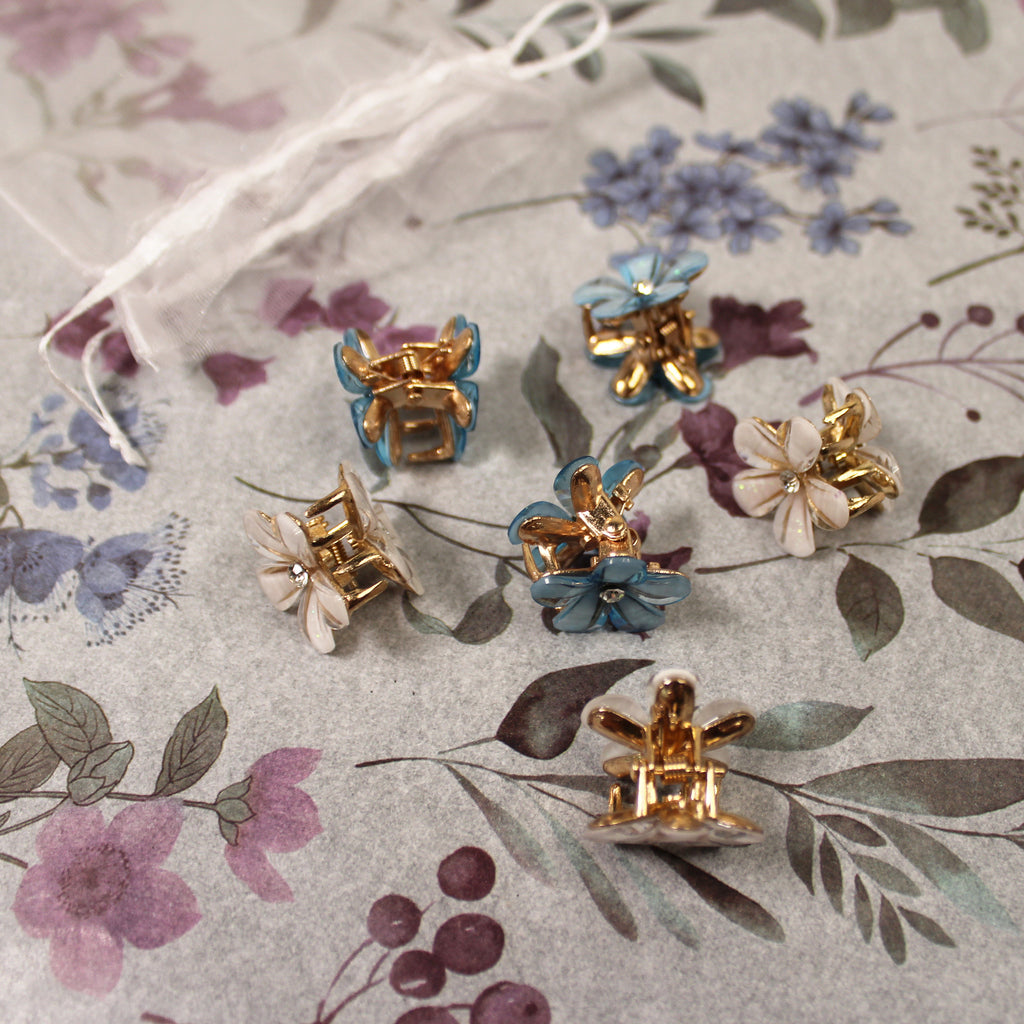 Skřipečky do vlasů ve tvaru květin. Balení obsahuje šest kusů bílých a modrých barev. Skřipečky mají třpytivý efekt, jsou lehké a udrží i silnější pramen vlasů. Součástí balení je organzový sáček.