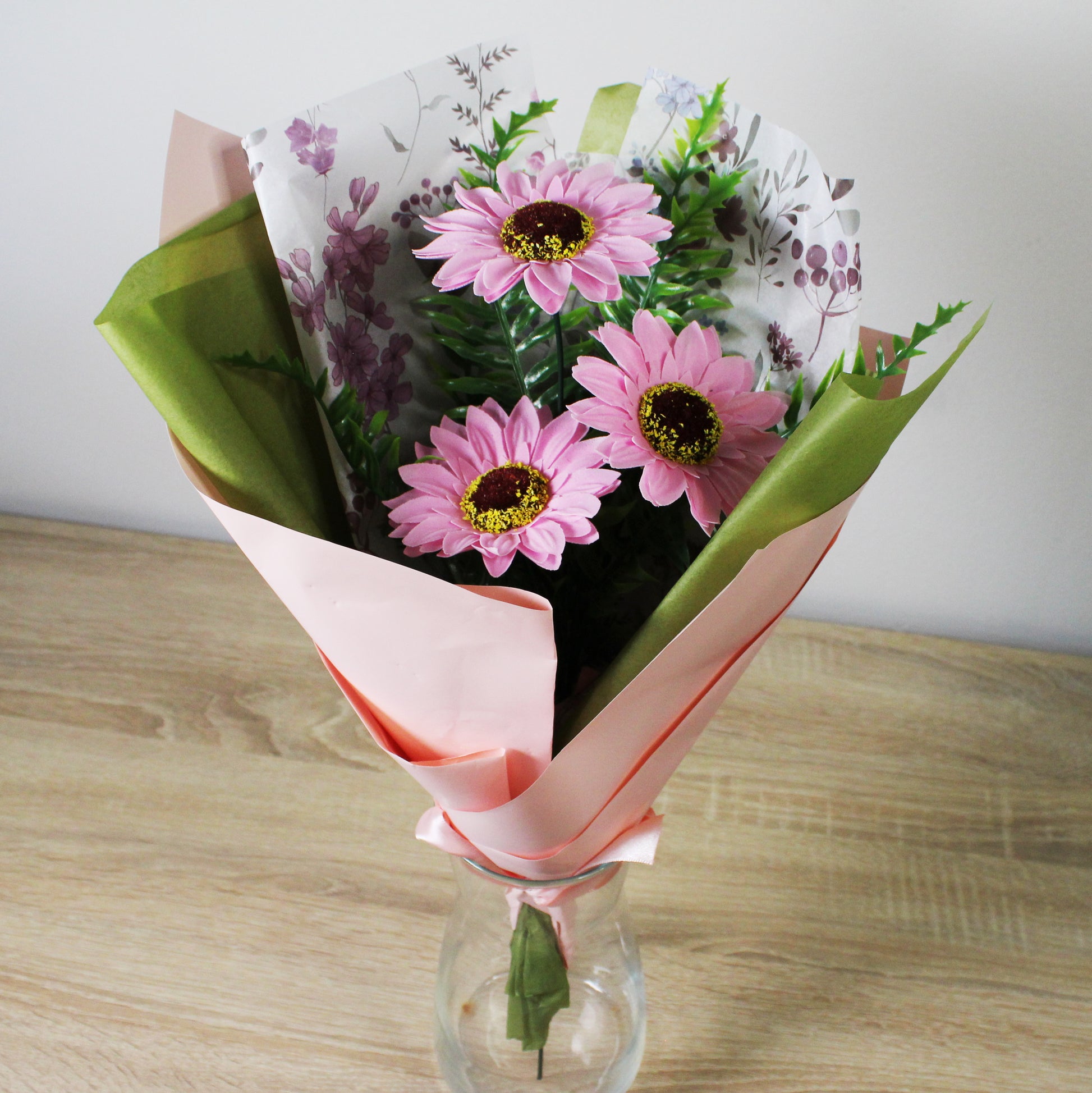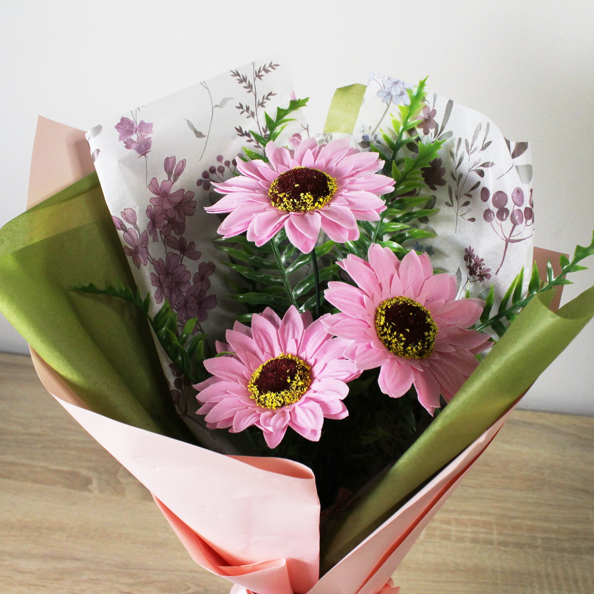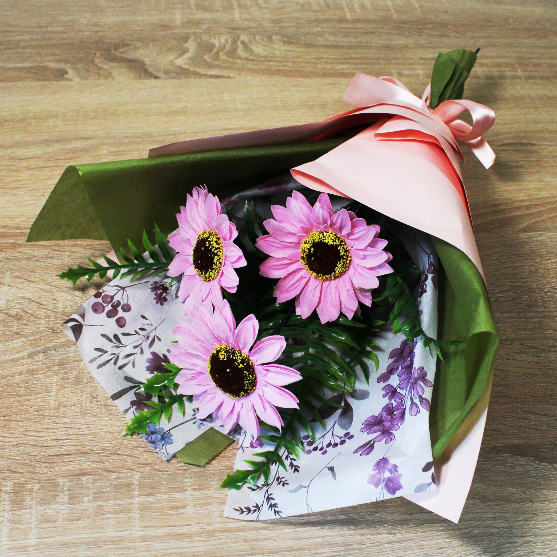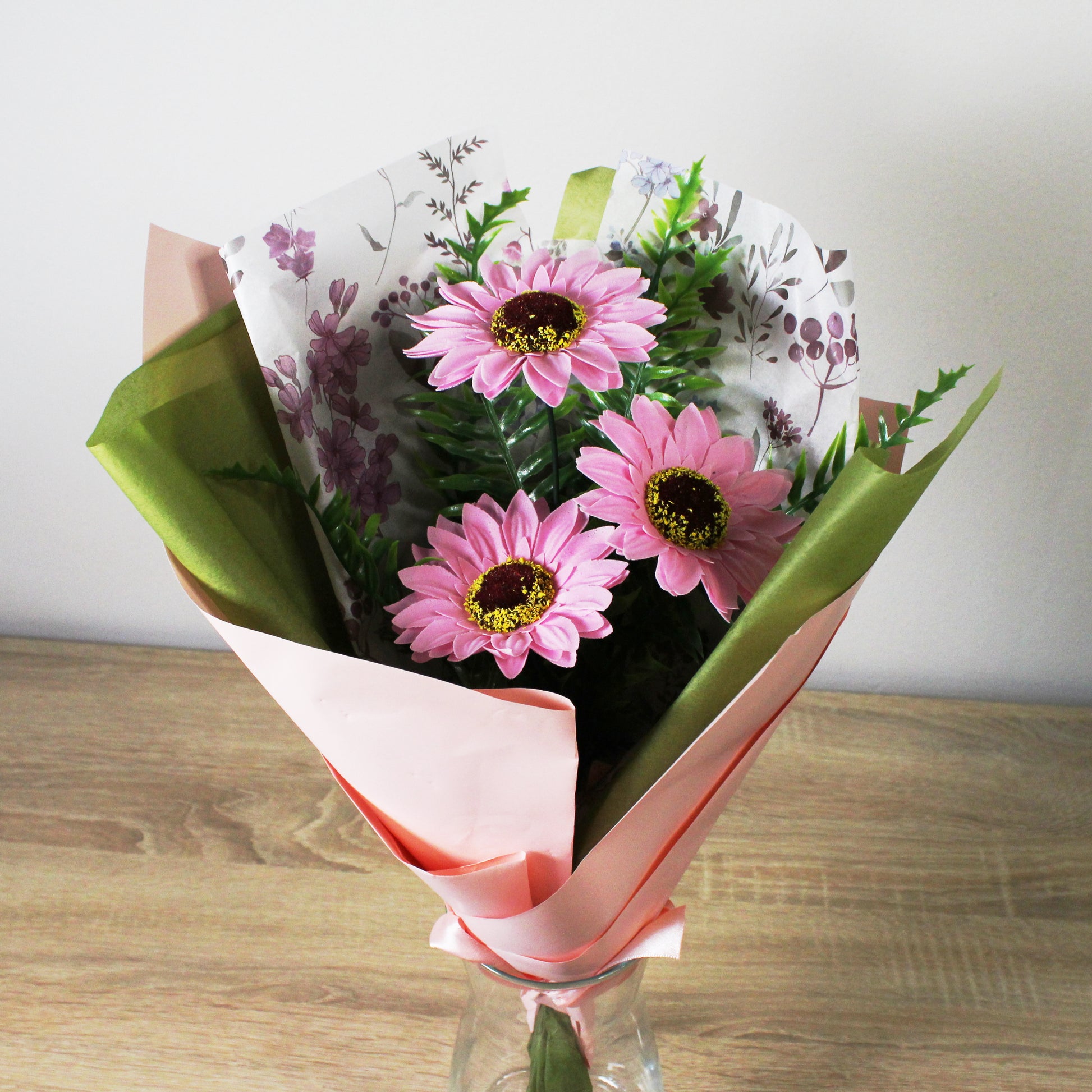 Tři růžové gerbery z mýdlových plátků naaranžované do sváteční kytice zabalené do okrasné manžety s mašlí. Mýdlo je vhodné pro všechny typy pokožky. Netradiční vkusný dárek k drobným příležitostem jako je svátek, nebo dárek pro učitelku.