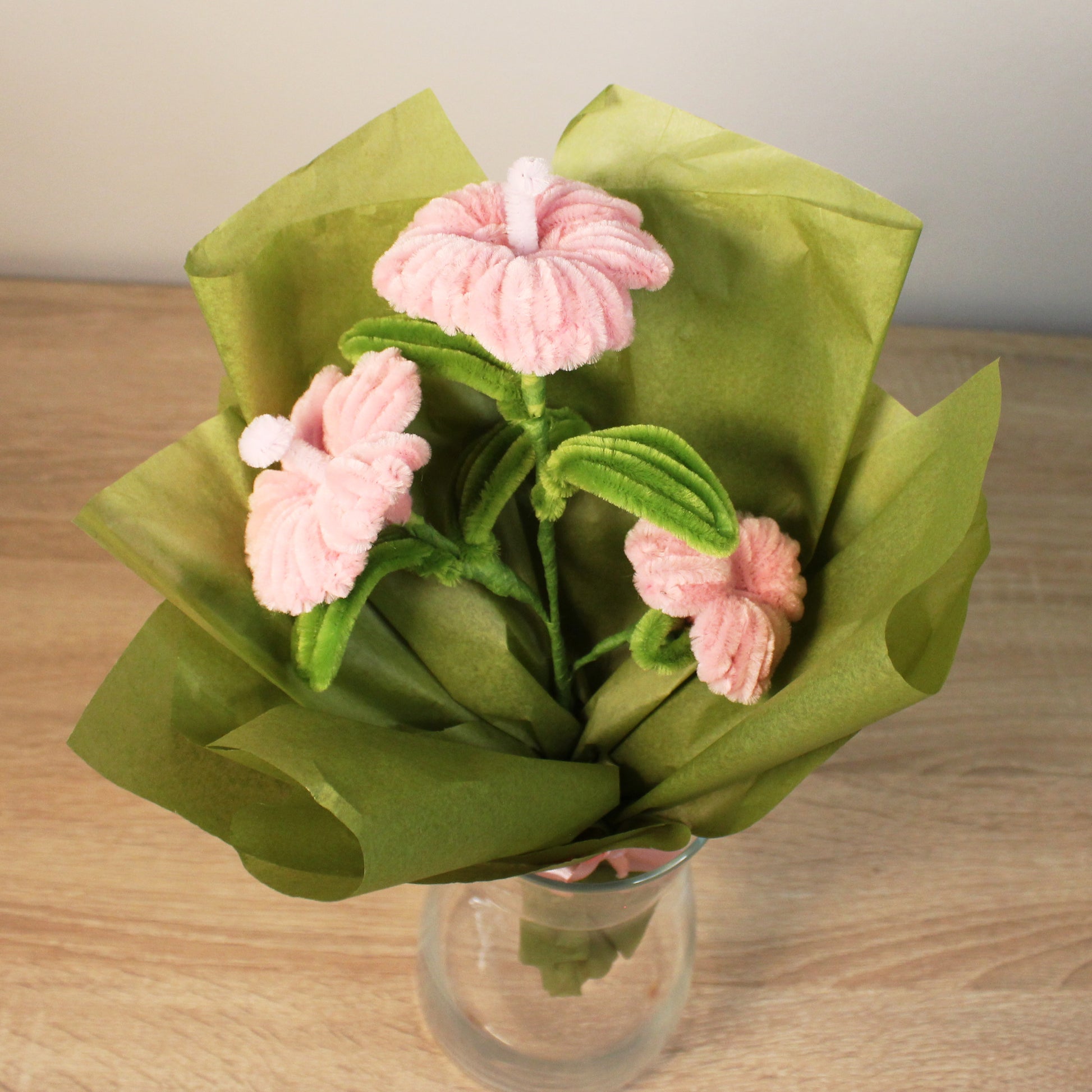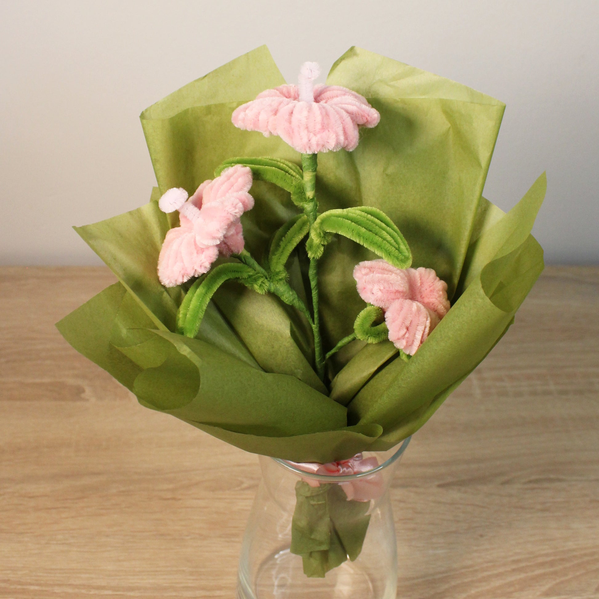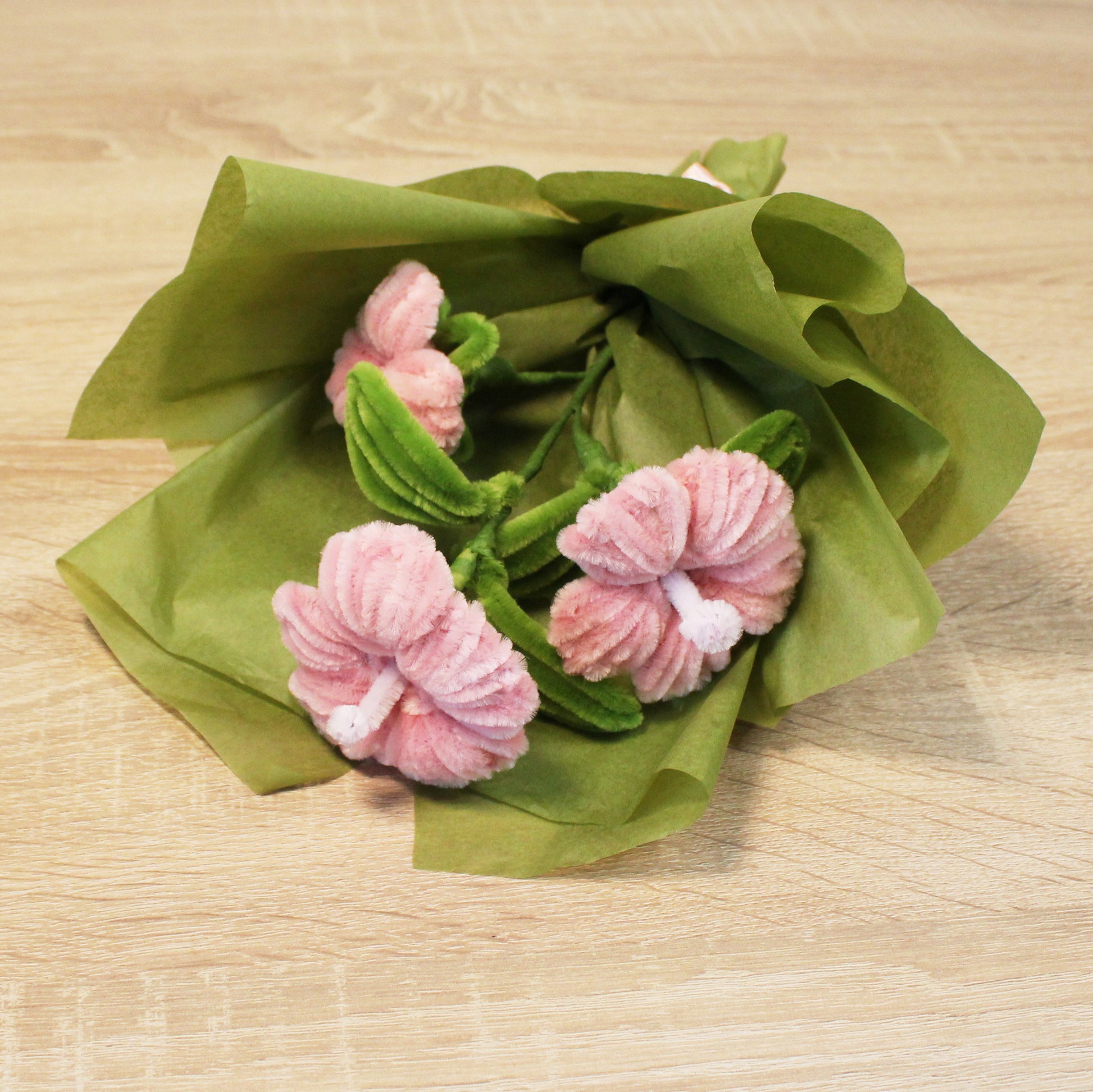 Ručně vyrobená květina z žinylkových drátků, zabalená v papírové manžetě s mašlí.