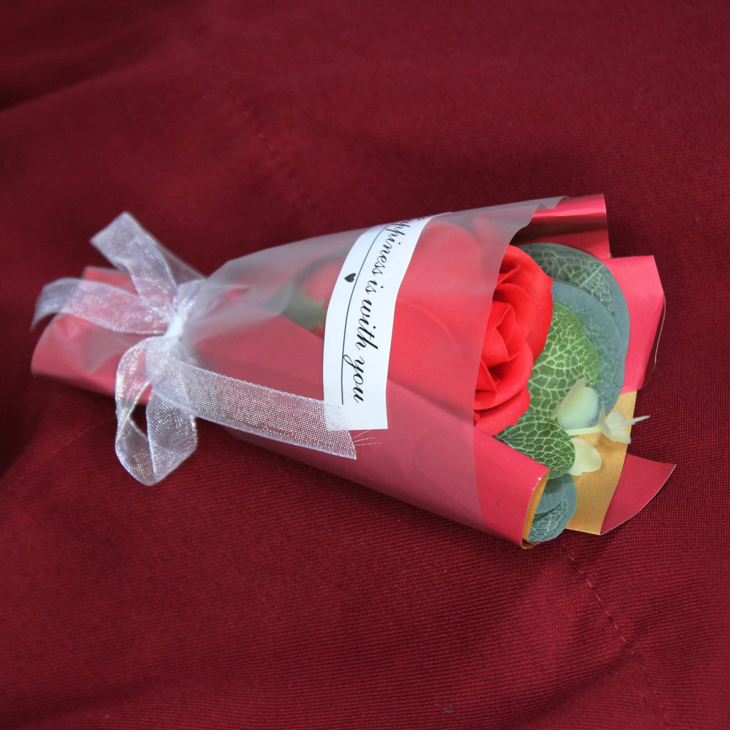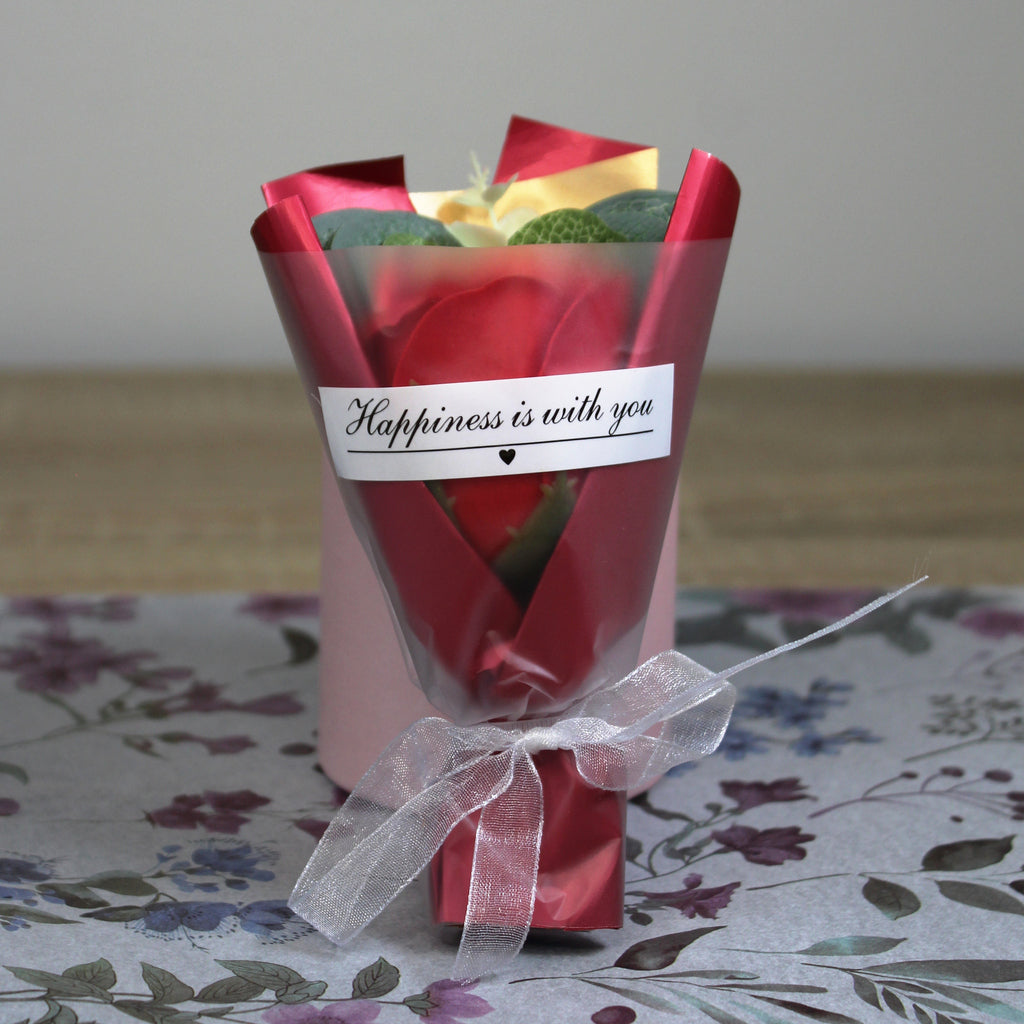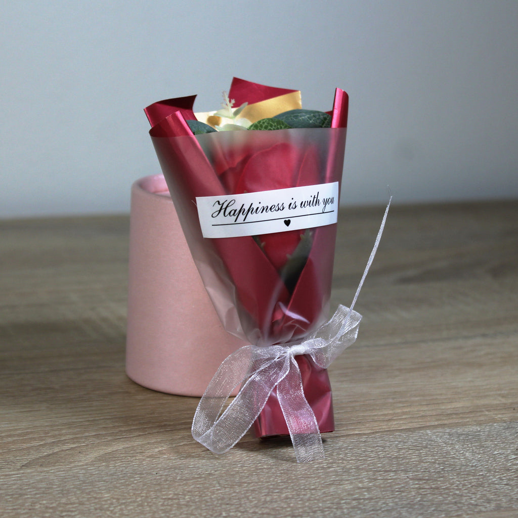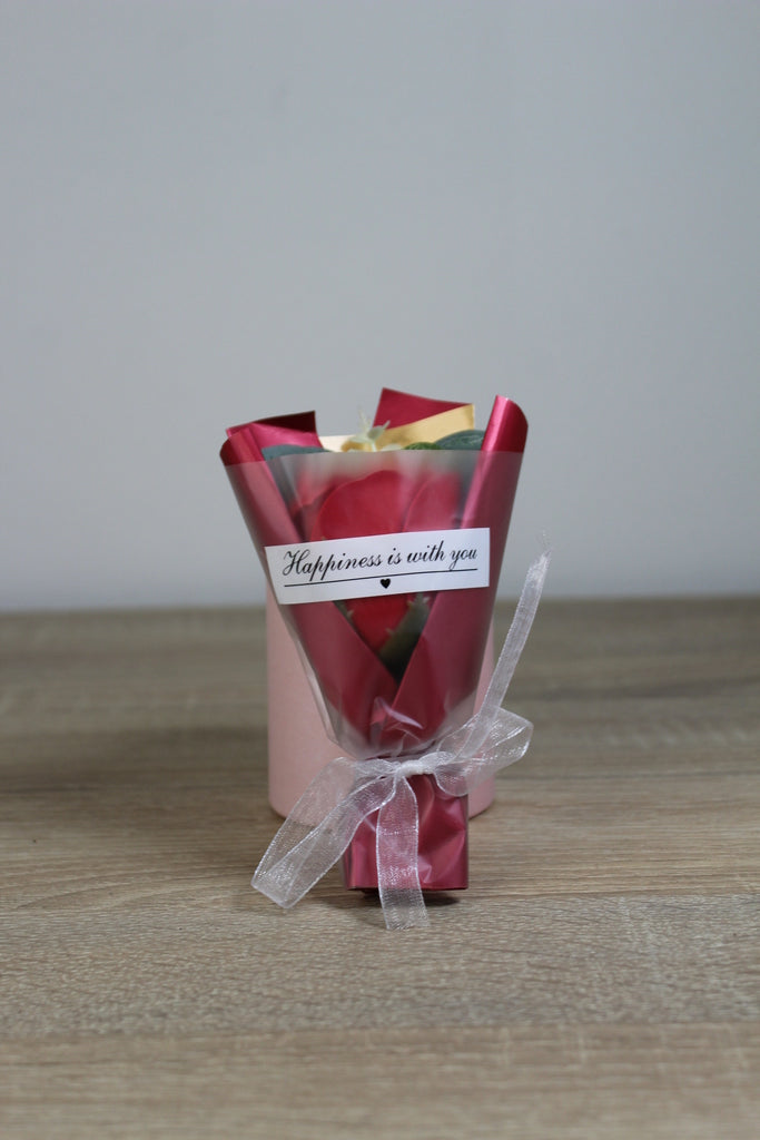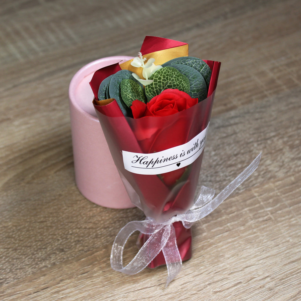Potěšte své blízké malou pozorností jako je roztomilá mýdlová růže. Tuto malou kytičku tvoří mýdlová růže, umělý eukalyptus a okrasná manžeta s mašličkou.