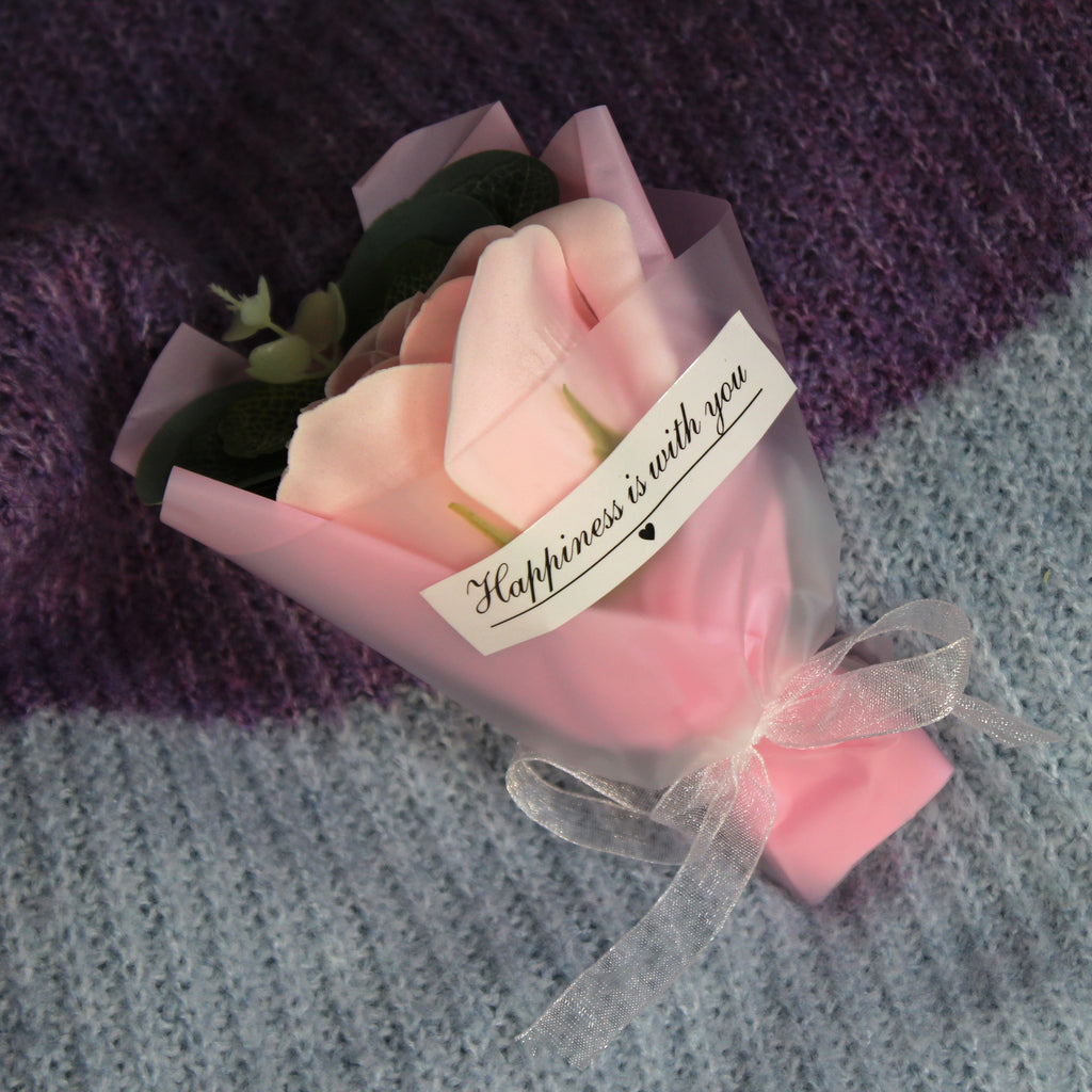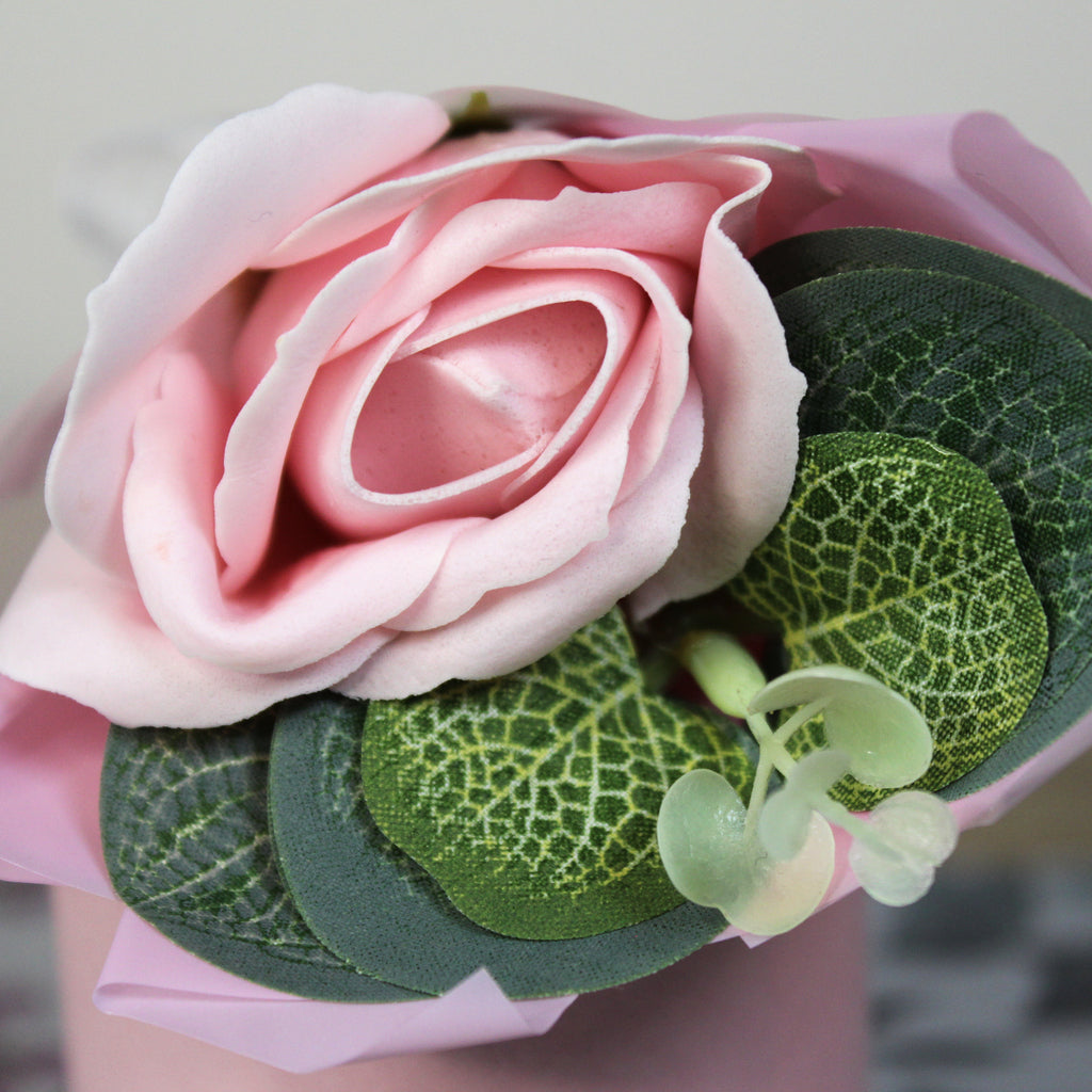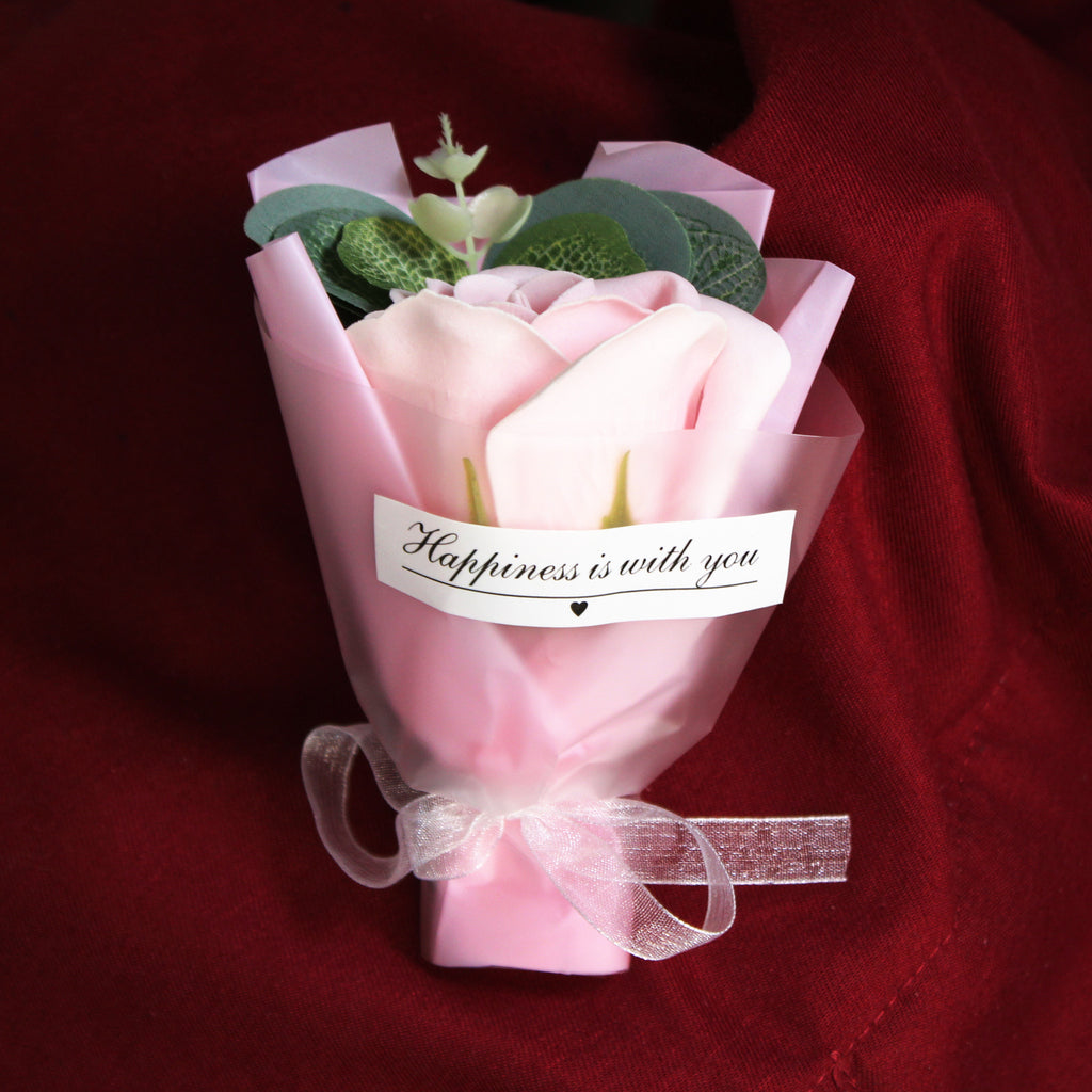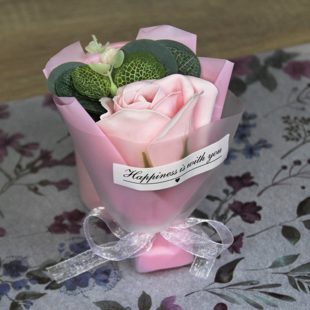 Potěšte své blízké malou pozorností jako je roztomilá mýdlová růže. Tuto malou kytičku tvoří mýdlová růže, umělý eukalyptus a okrasná manžeta s mašličkou.