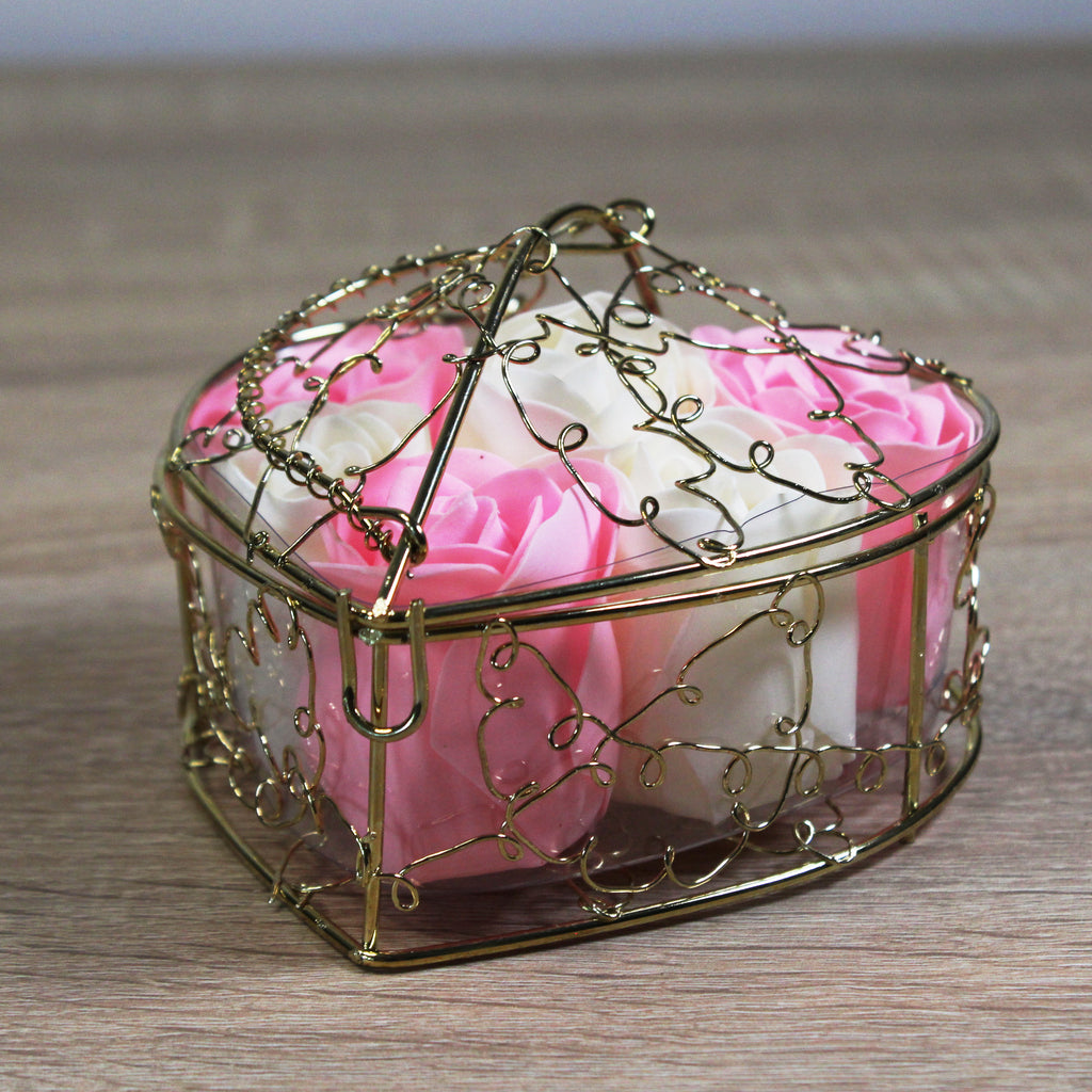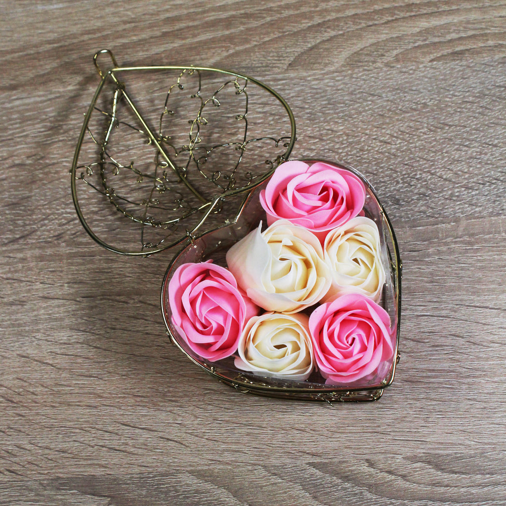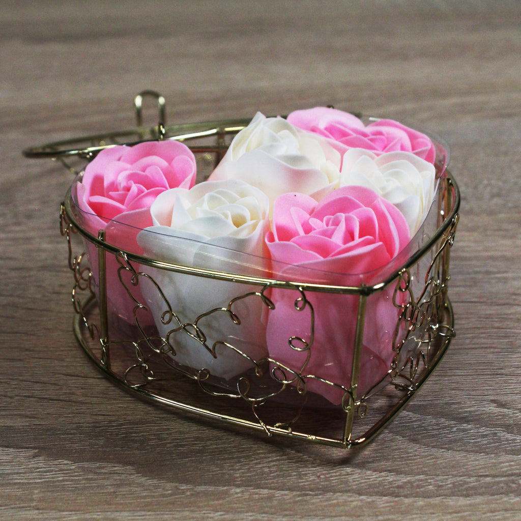 Šest kusů mýdlových růžích v železném košíku ve tvaru srdce. Ideální dárek k výročí, Valentýnu, svátku ale i pro maminku. Dárkové balení je součást ceny.