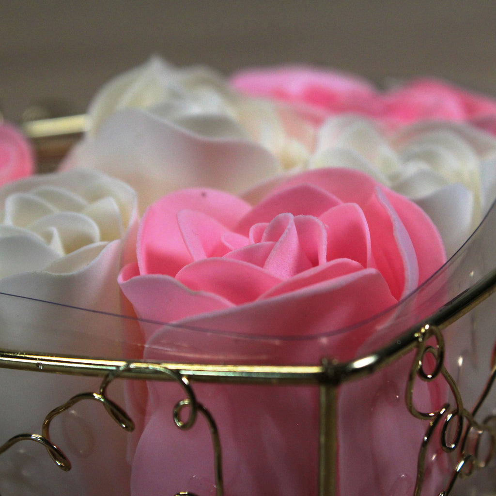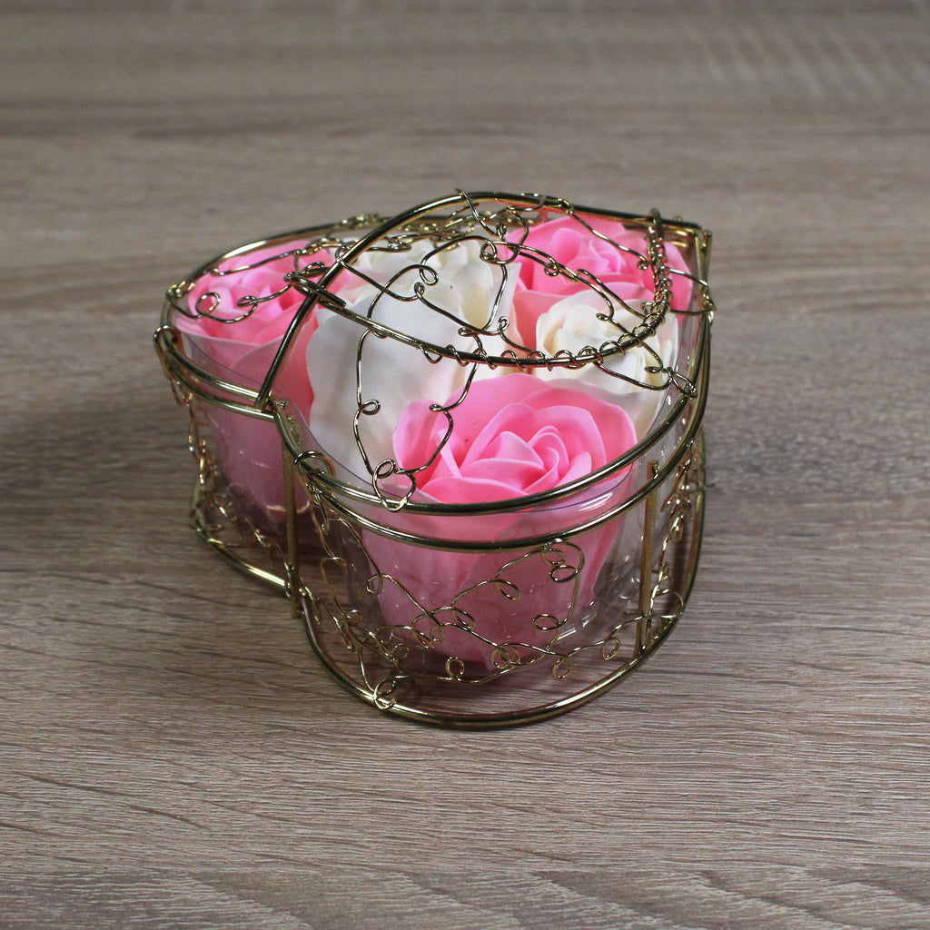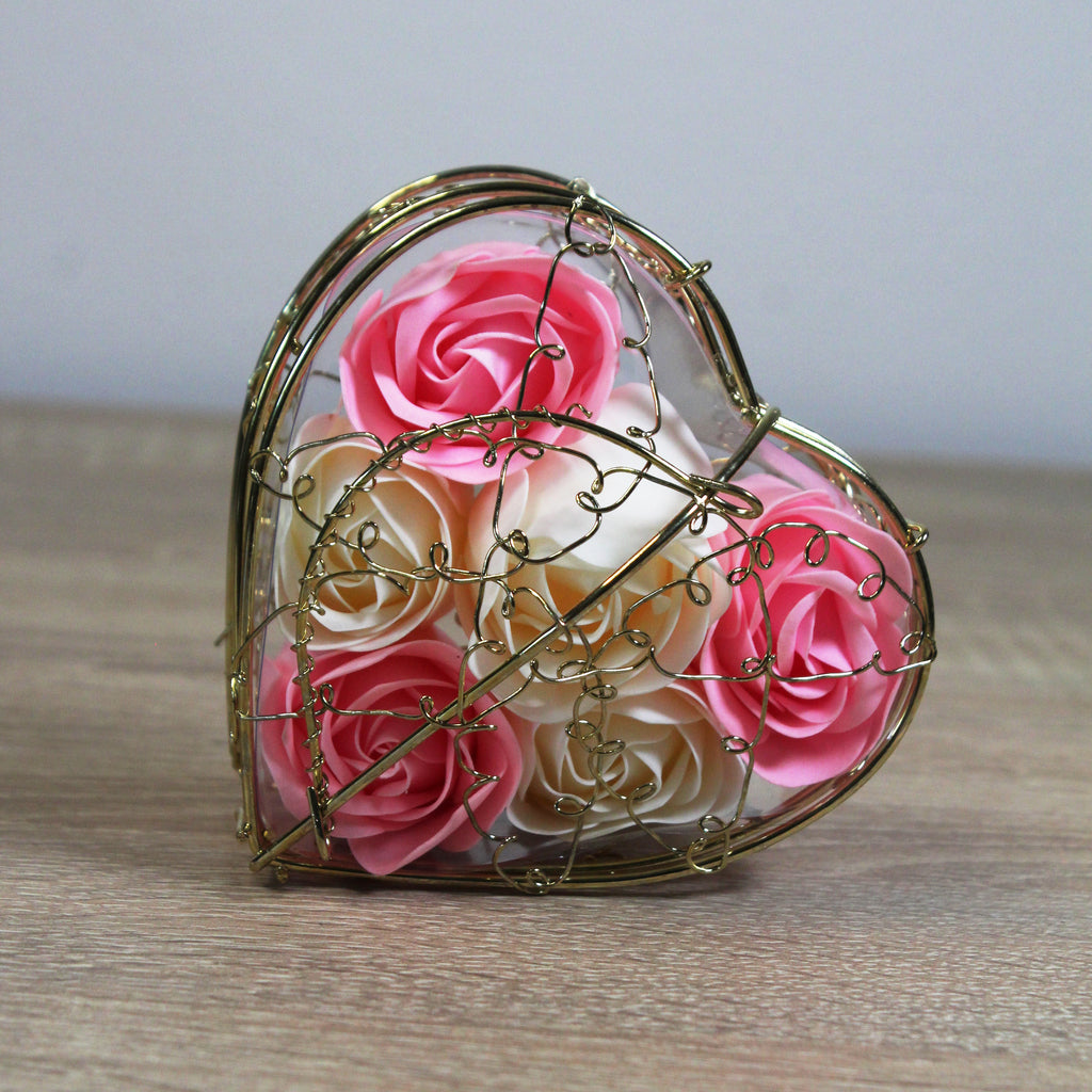 Šest kusů mýdlových růžích v železném košíku ve tvaru srdce. Ideální dárek k výročí, Valentýnu, svátku ale i pro maminku. Dárkové balení je součást ceny.