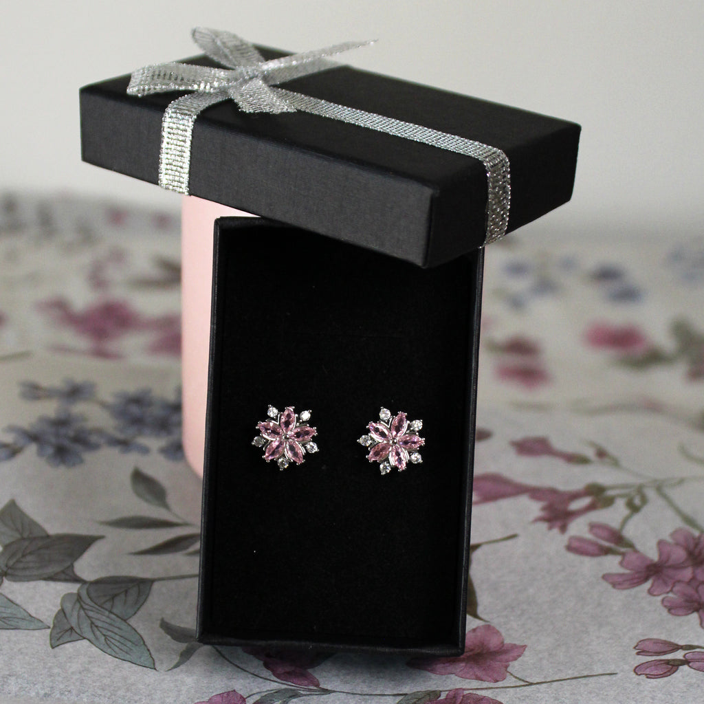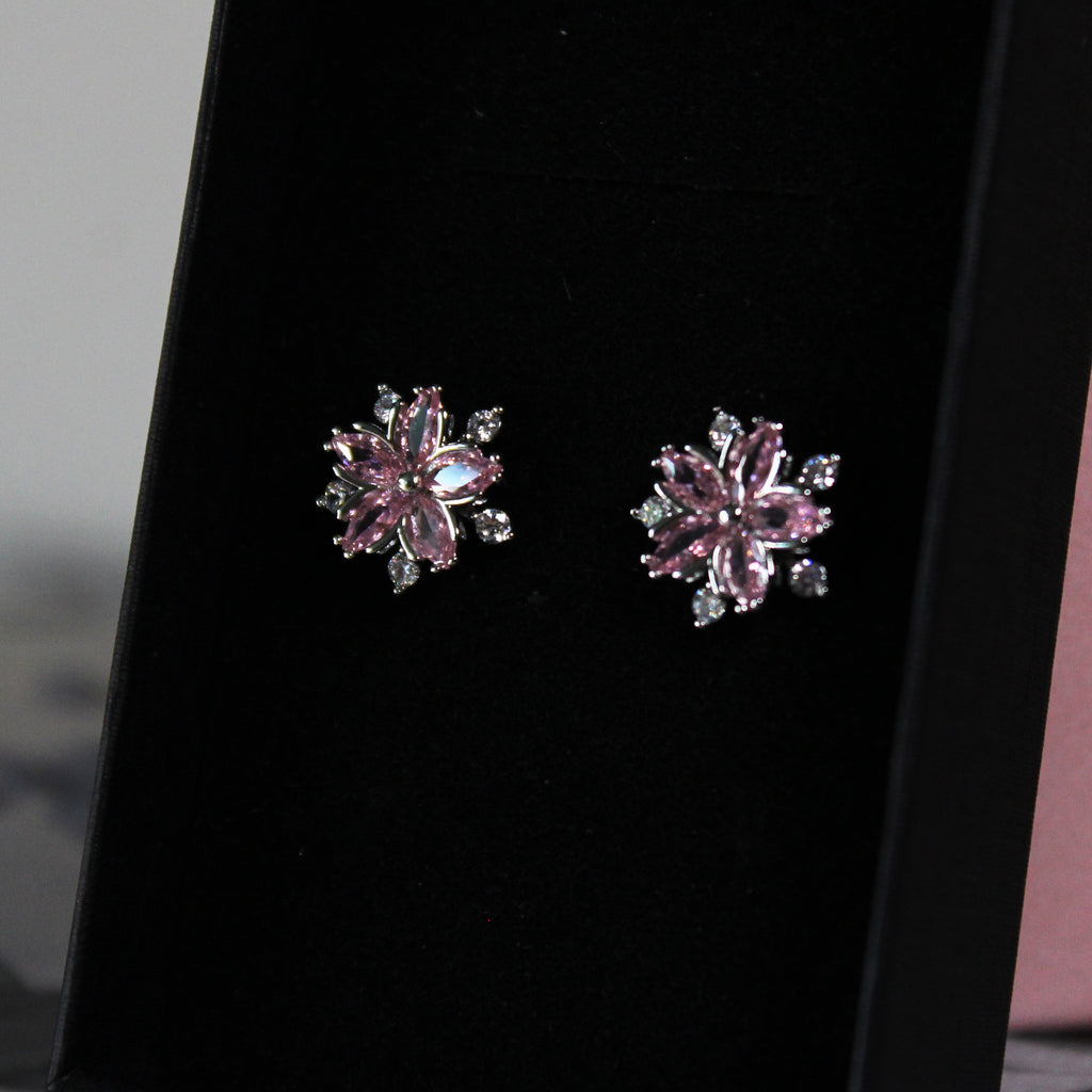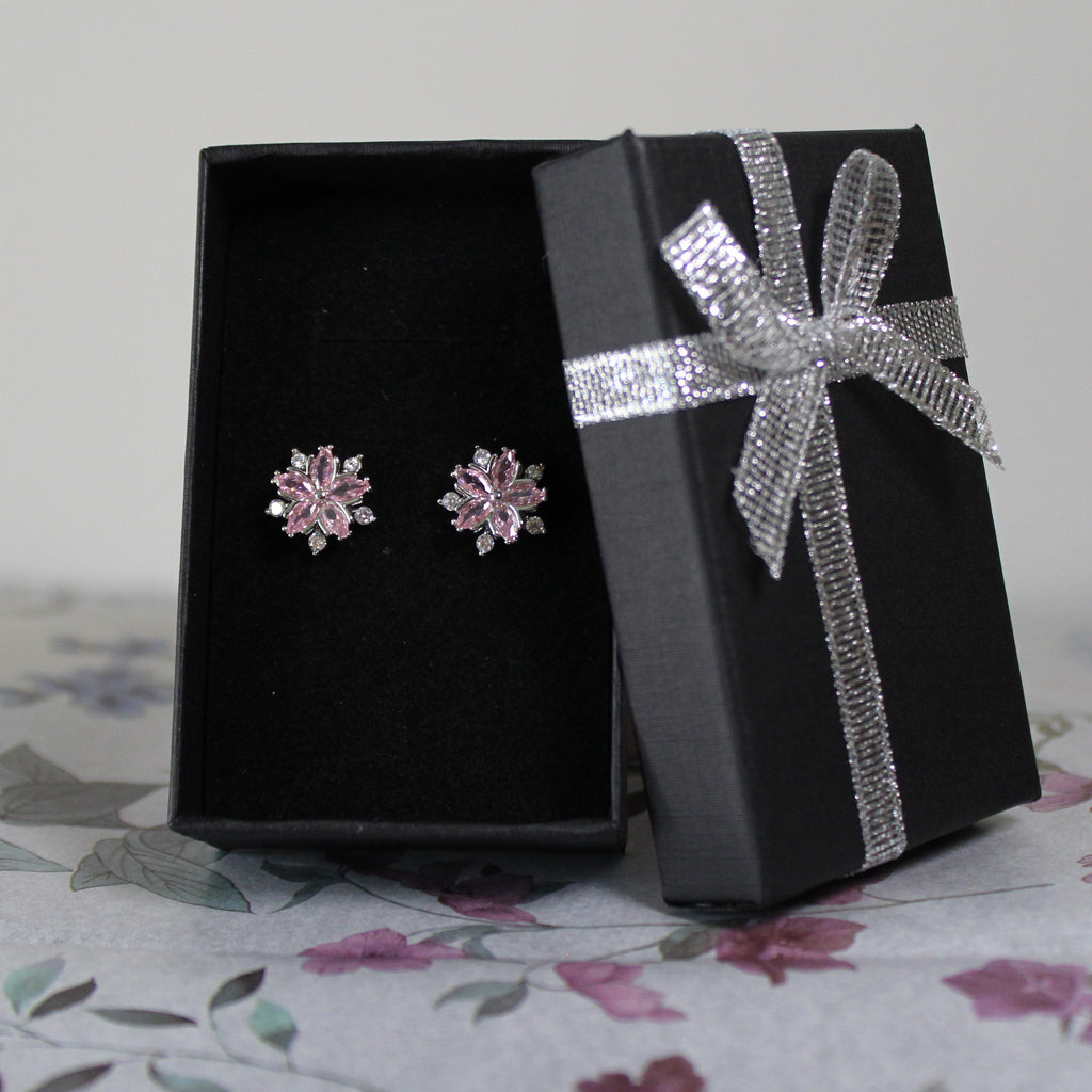 Hypoalergenní květinové náušnice připomínající květ třešní. Tyto nevšední náušnice mají třpytivý vzhled. Potěší jako dárek pro každou příležitost. Skvěle doplní společenský outfit k mimořádným událostem. Samozřejmostí je dárkové balení včetně elegantní černé krabičky s mašlí.