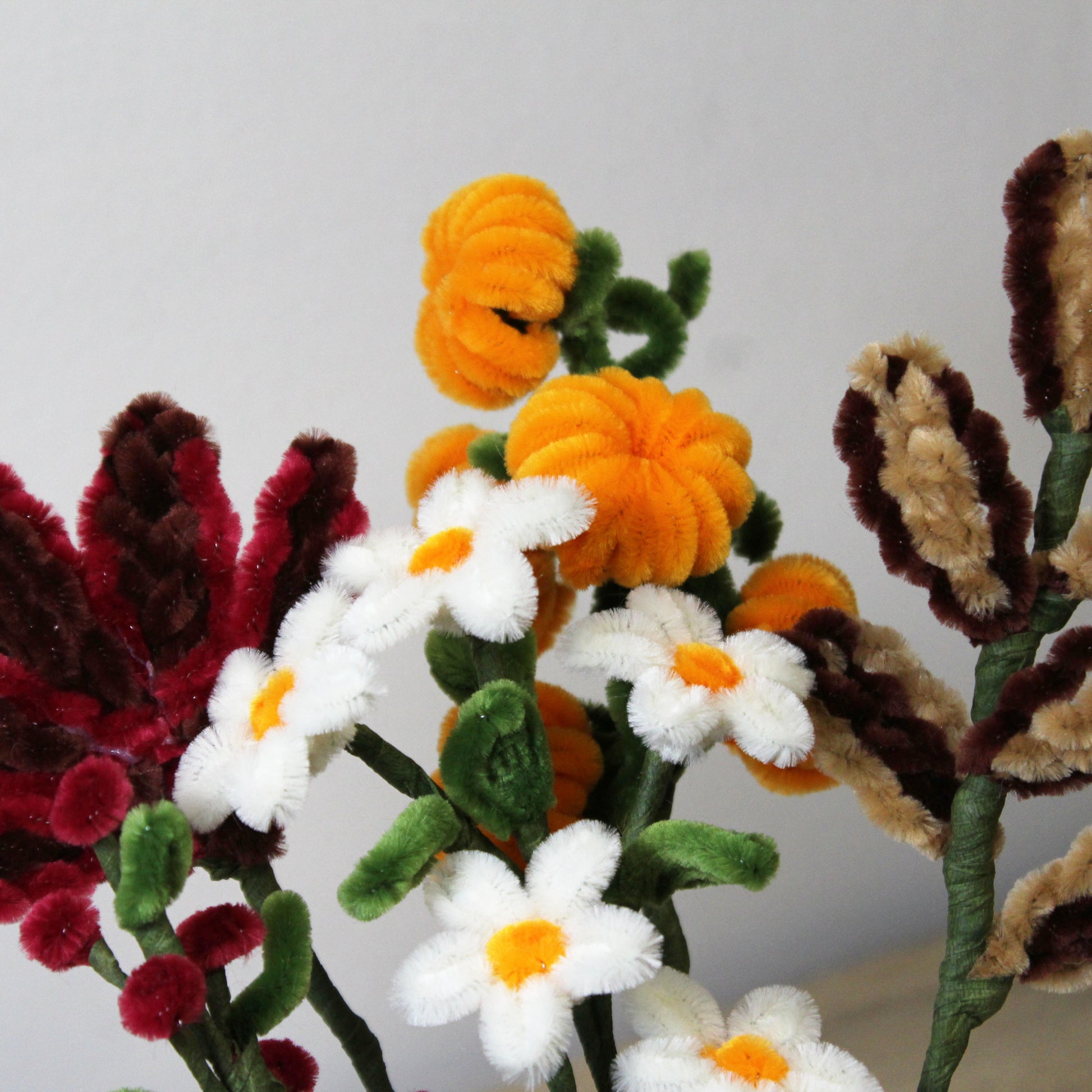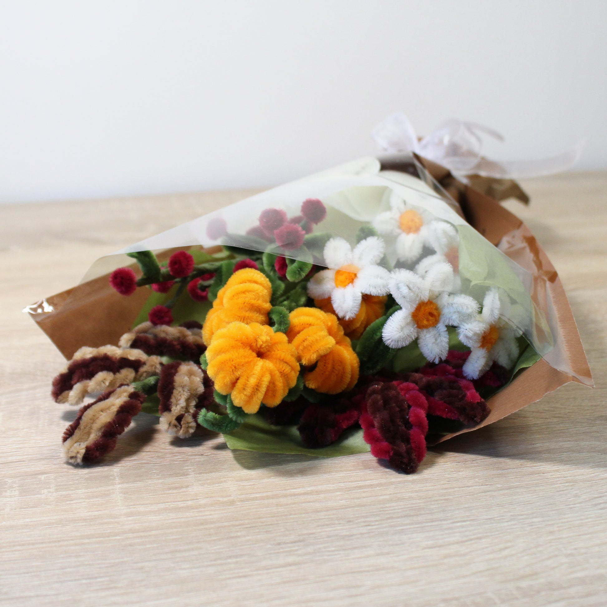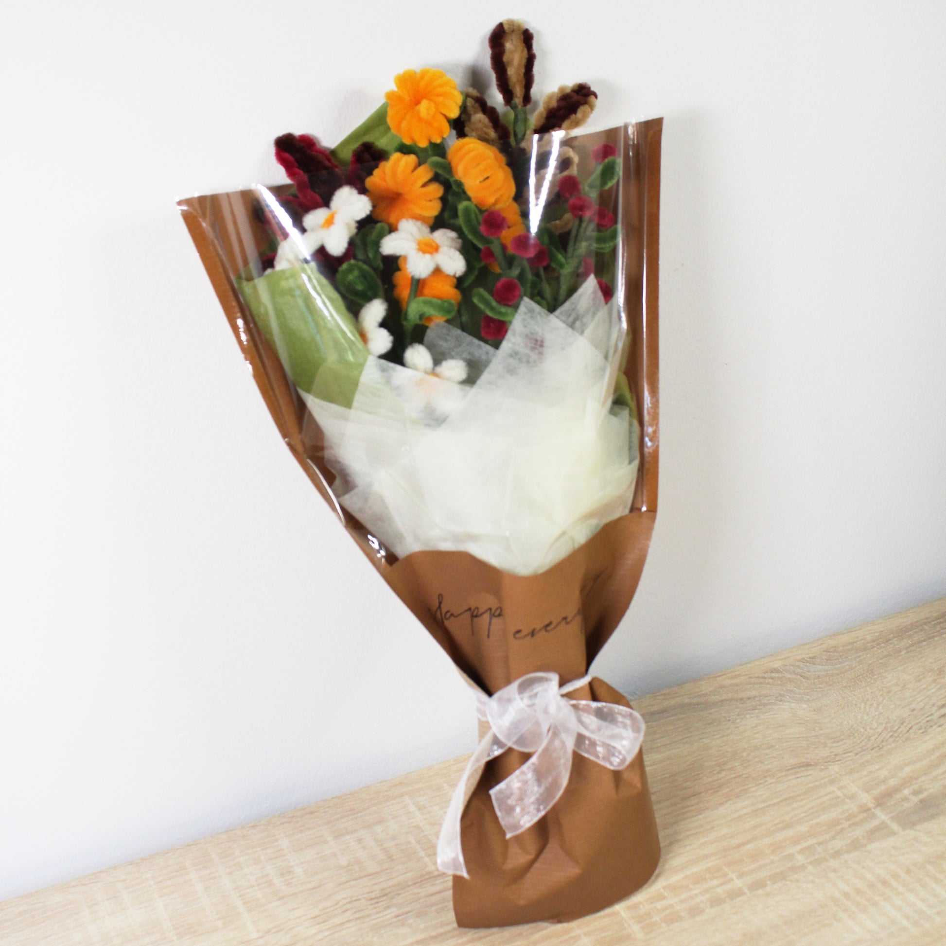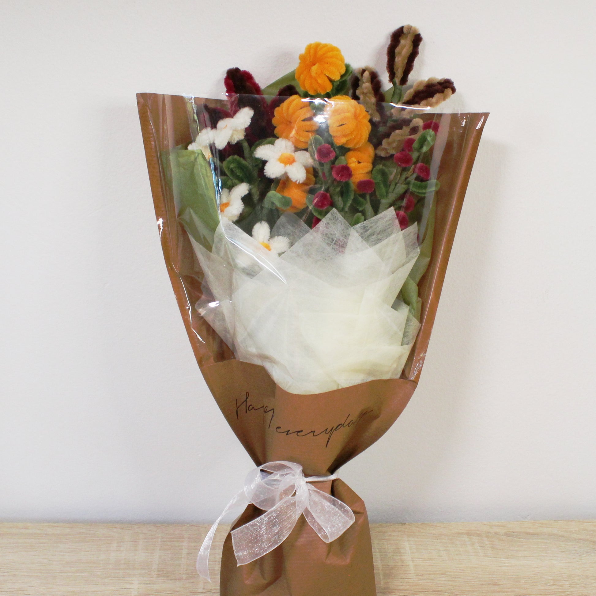 Tato kytice je tvořena ručně vyráběnými květinami z chlupatých drátků tzv. pipe cleaners. Předností této kytice je její podzimní atmosféra. Přítomné květiny imitují kominíčka, heřmánek, dýničky, dubovou větvičku a javorový list. Celý pugét je zabalený v kraftovém papíru, celofánu a hedvábných papírech. Tato vkusná kytice se hodí jako podzimní dekorace do bytu a nebo dárek pro mnoho příležitostí, kterými mohou být narozeniny, svátek, výročí, rozloučení v práci nebo dárek pro paní učitelku. Veselé, přírodní barvy kytice umožňují obdarovat jakoukoliv věkovou skupinu.