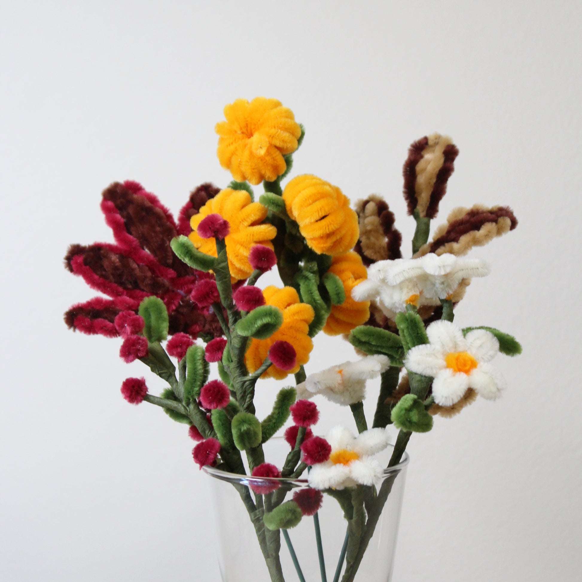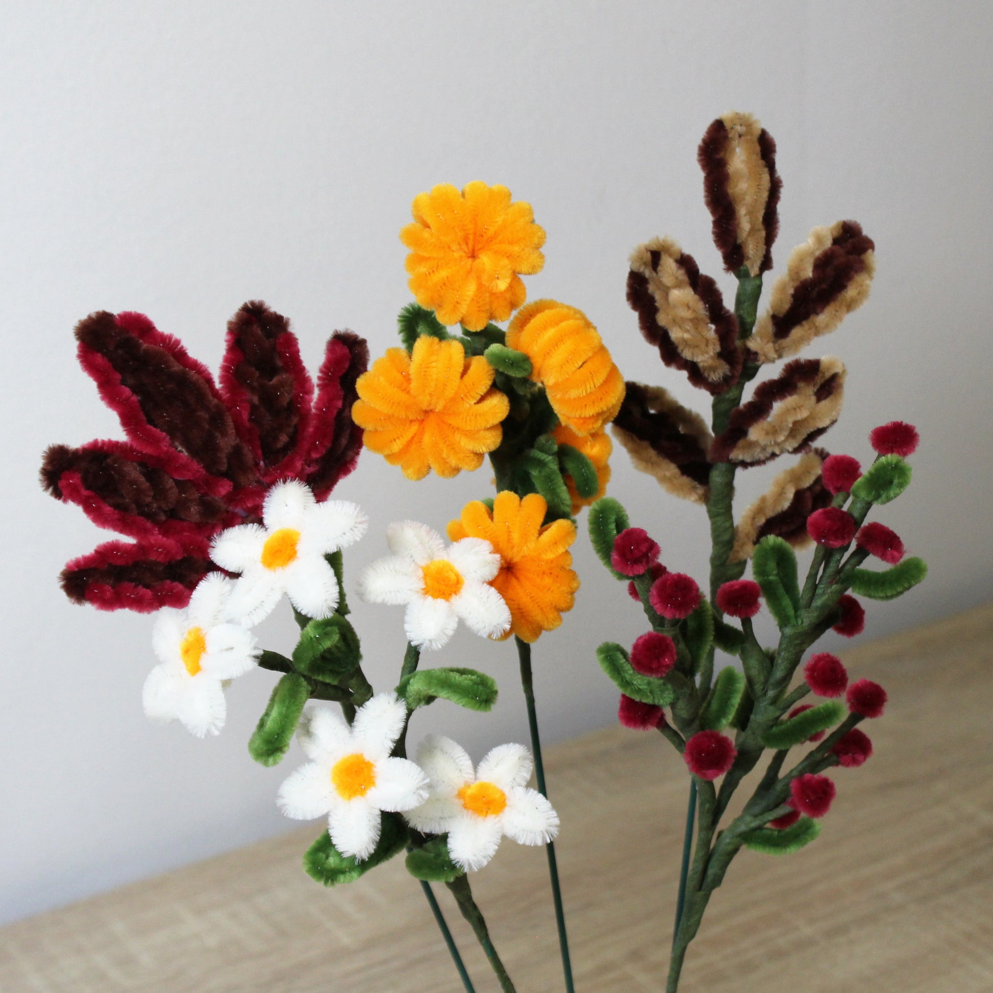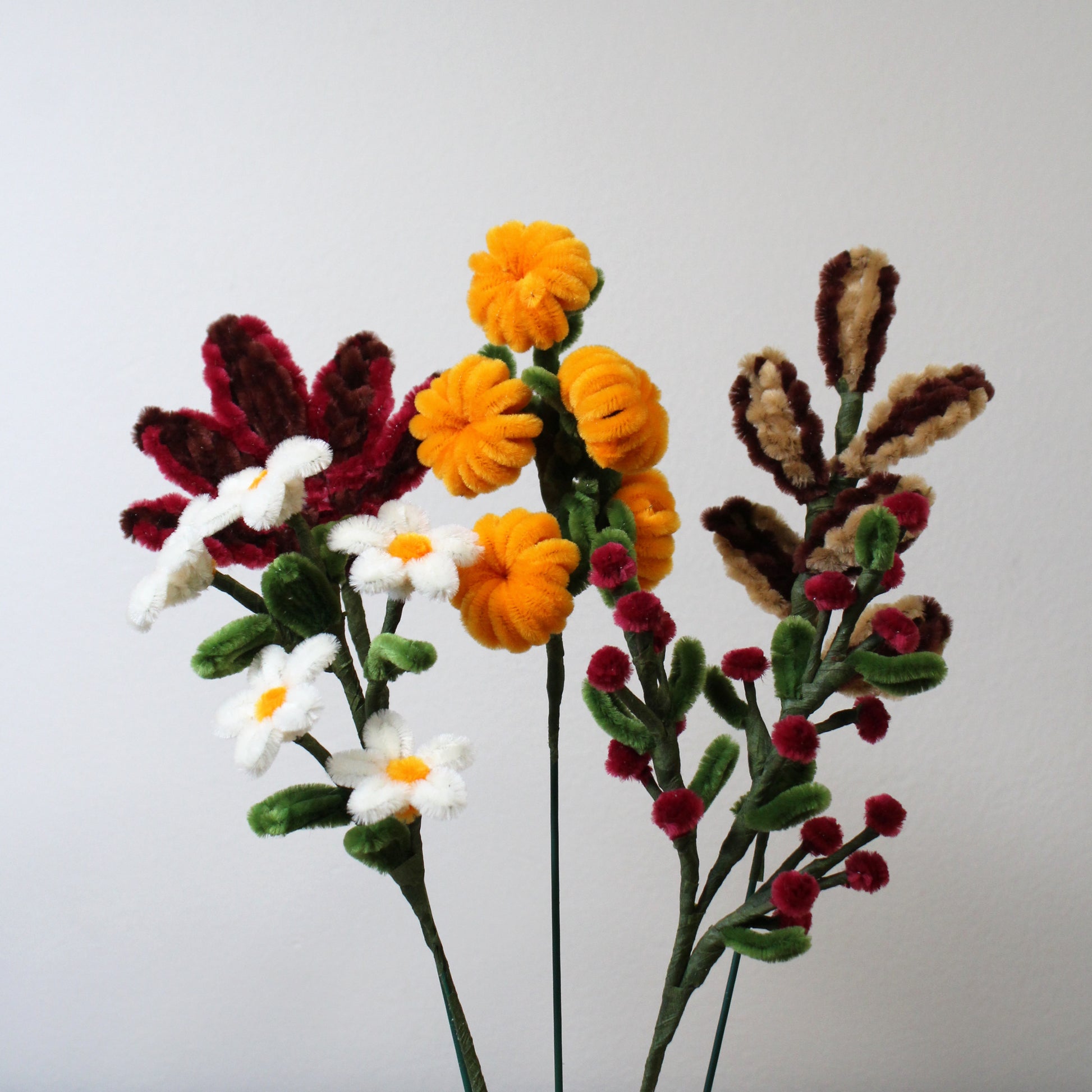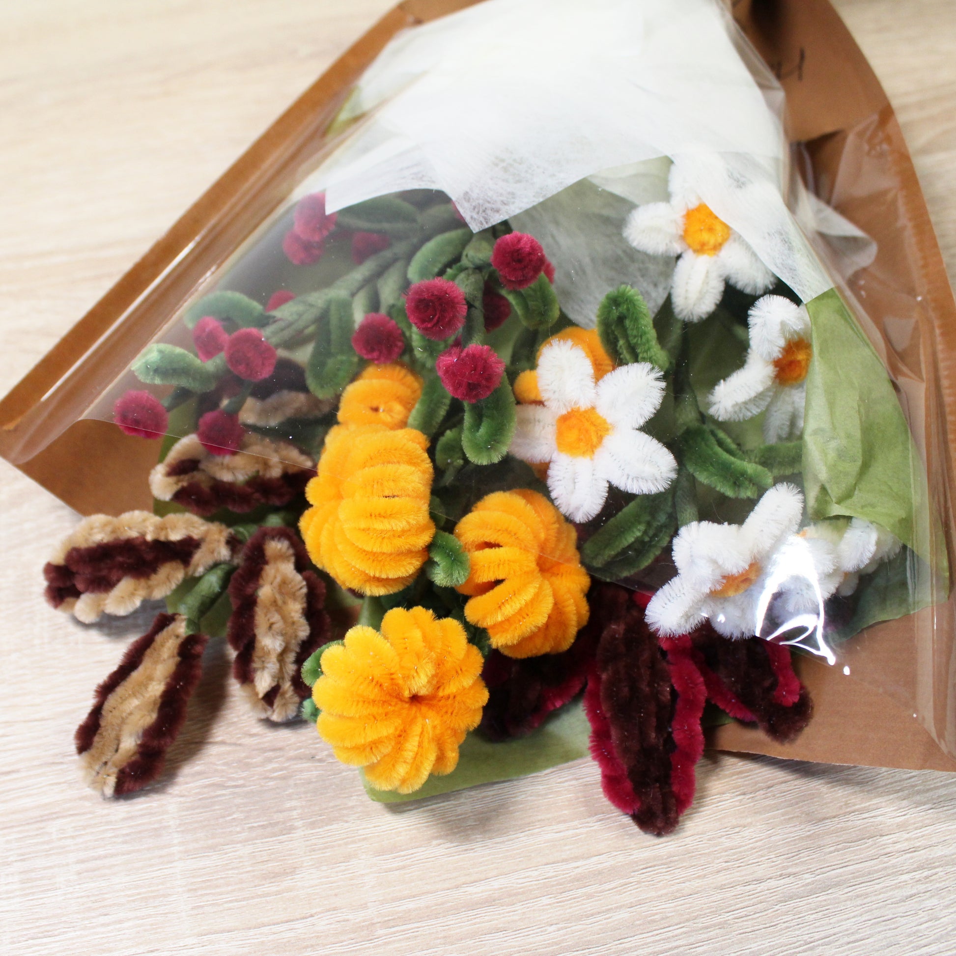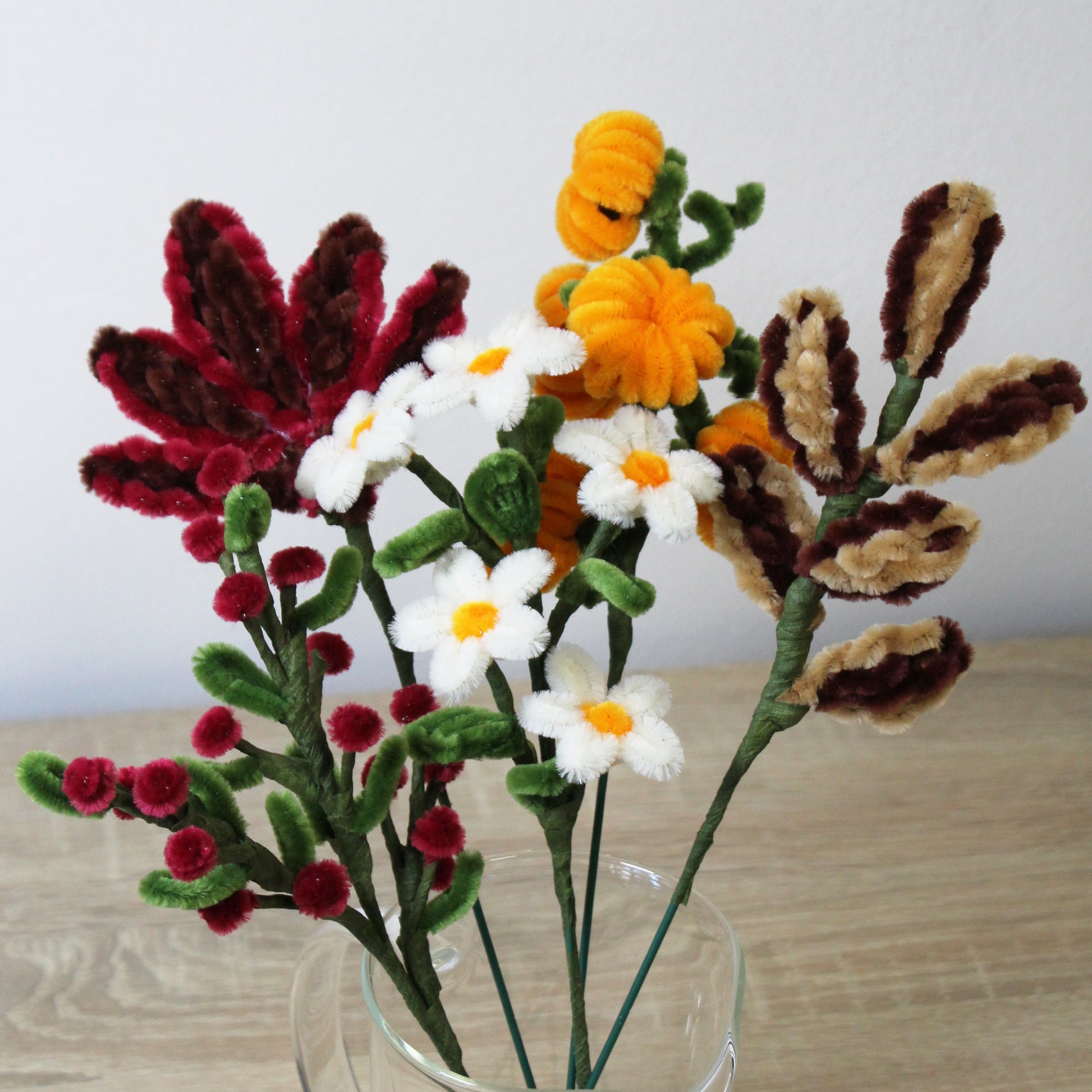Tato kytice je tvořena ručně vyráběnými květinami z chlupatých drátků tzv. pipe cleaners. Předností této kytice je její podzimní atmosféra. Přítomné květiny imitují kominíčka, heřmánek, dýničky, dubovou větvičku a javorový list. Celý pugét je zabalený v kraftovém papíru, celofánu a hedvábných papírech. Tato vkusná kytice se hodí jako podzimní dekorace do bytu a nebo dárek pro mnoho příležitostí, kterými mohou být narozeniny, svátek, výročí, rozloučení v práci nebo dárek pro paní učitelku. Veselé, přírodní barvy kytice umožňují obdarovat jakoukoliv věkovou skupinu.