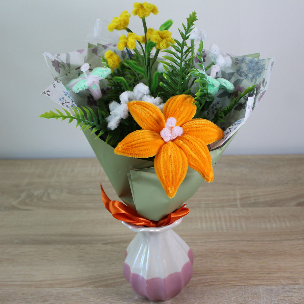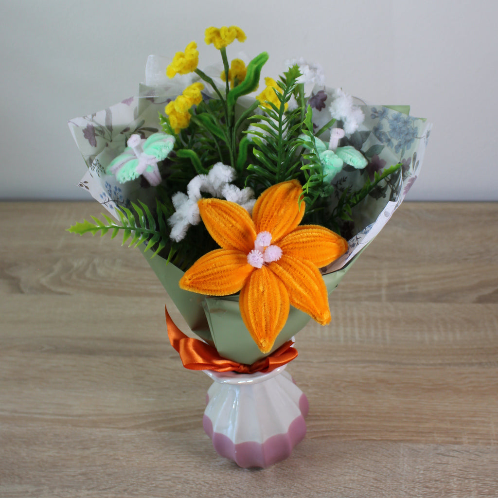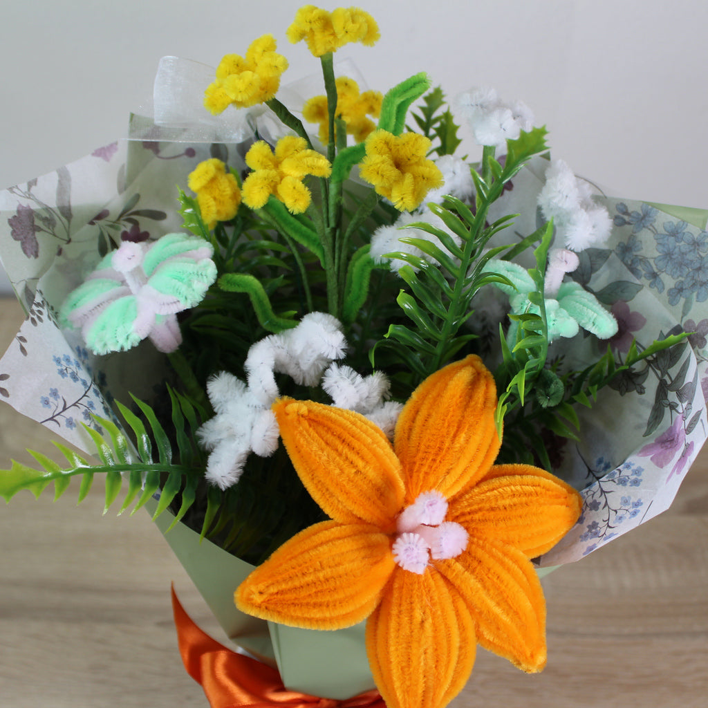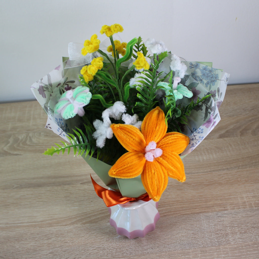 Handmade kytice z žinylkových drátků, která rozzáří váš domov a udělá radost všem, co milují květiny, nebo ocení ruční práci. Chcete darovat květinu, ale bojíte se že nevydrží bez vody, dlouhý převoz autem, horko a nebo naopak mráz? Tak s touhle kyticí se bát nemusíte.
