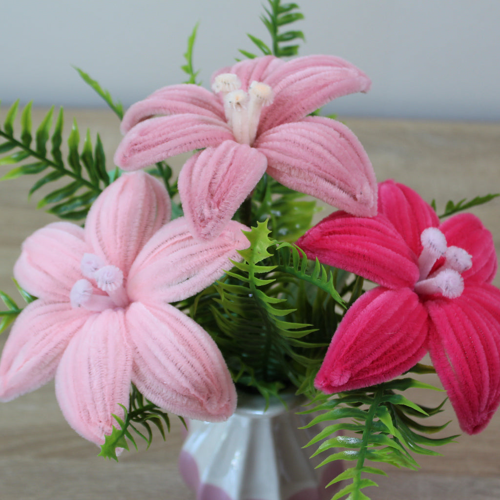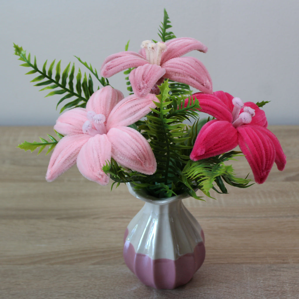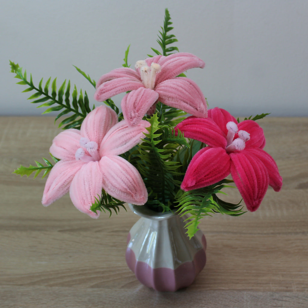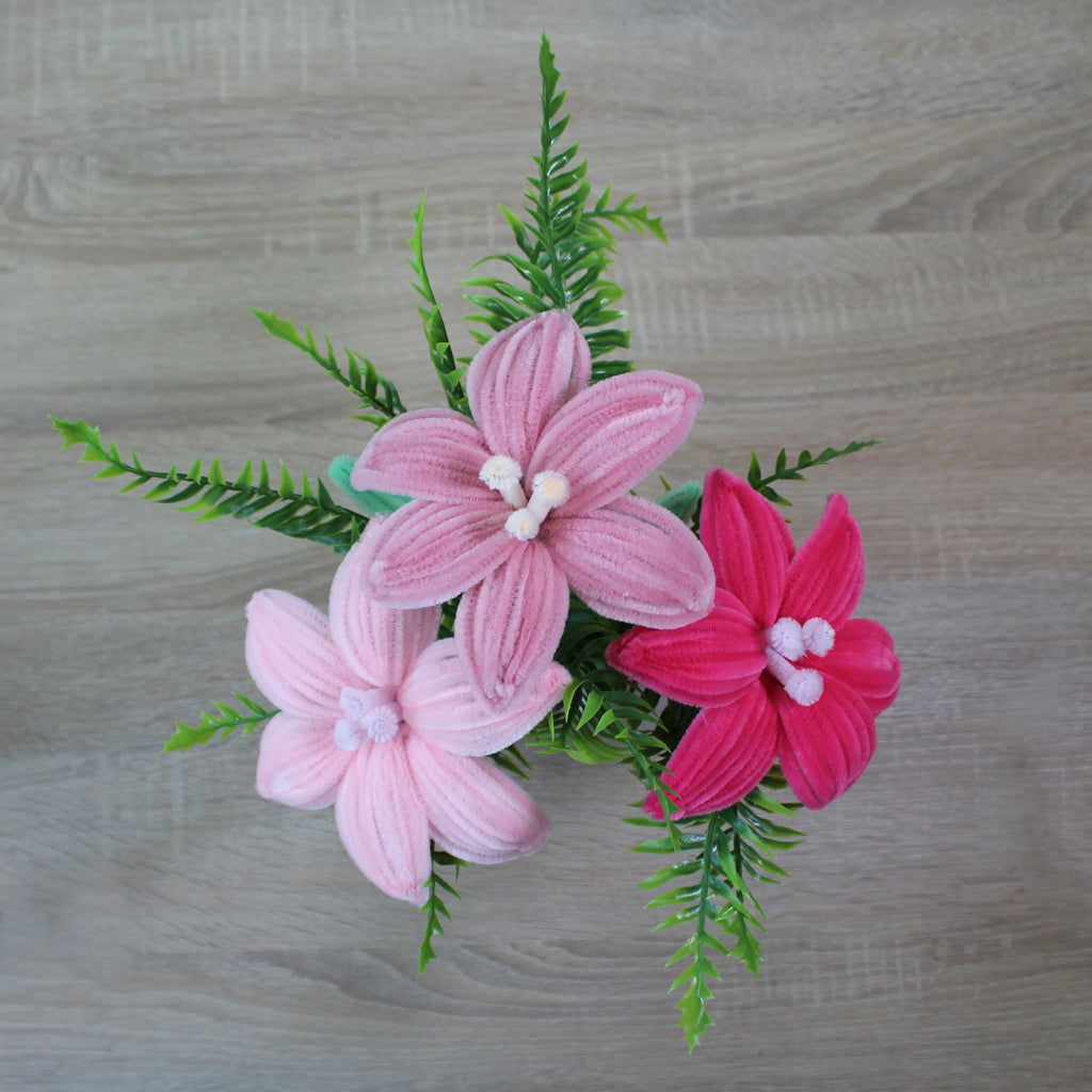 Handmade kytice lilie z žinylkových drátků, která rozzáří váš domov a udělá radost všem, co milují květiny, nebo ocení ruční práci. Chcete darovat květinu, ale bojíte se že nevydrží bez vody, dlouhý převoz autem, horko a nebo naopak mráz? Tak s touhle kyticí se bát nemusíte.