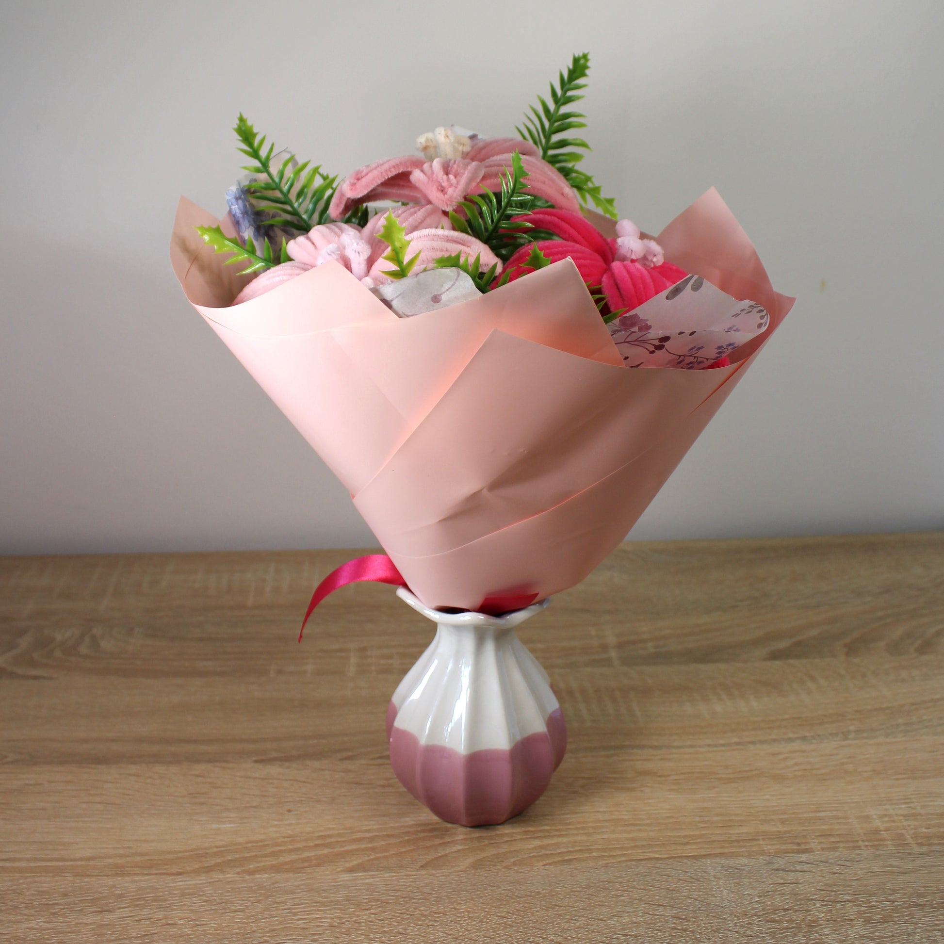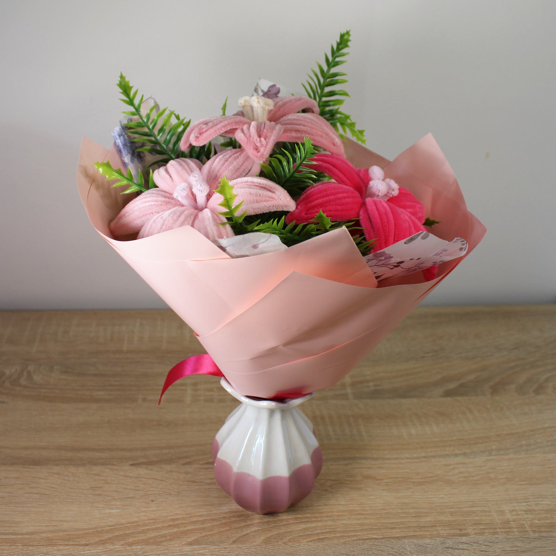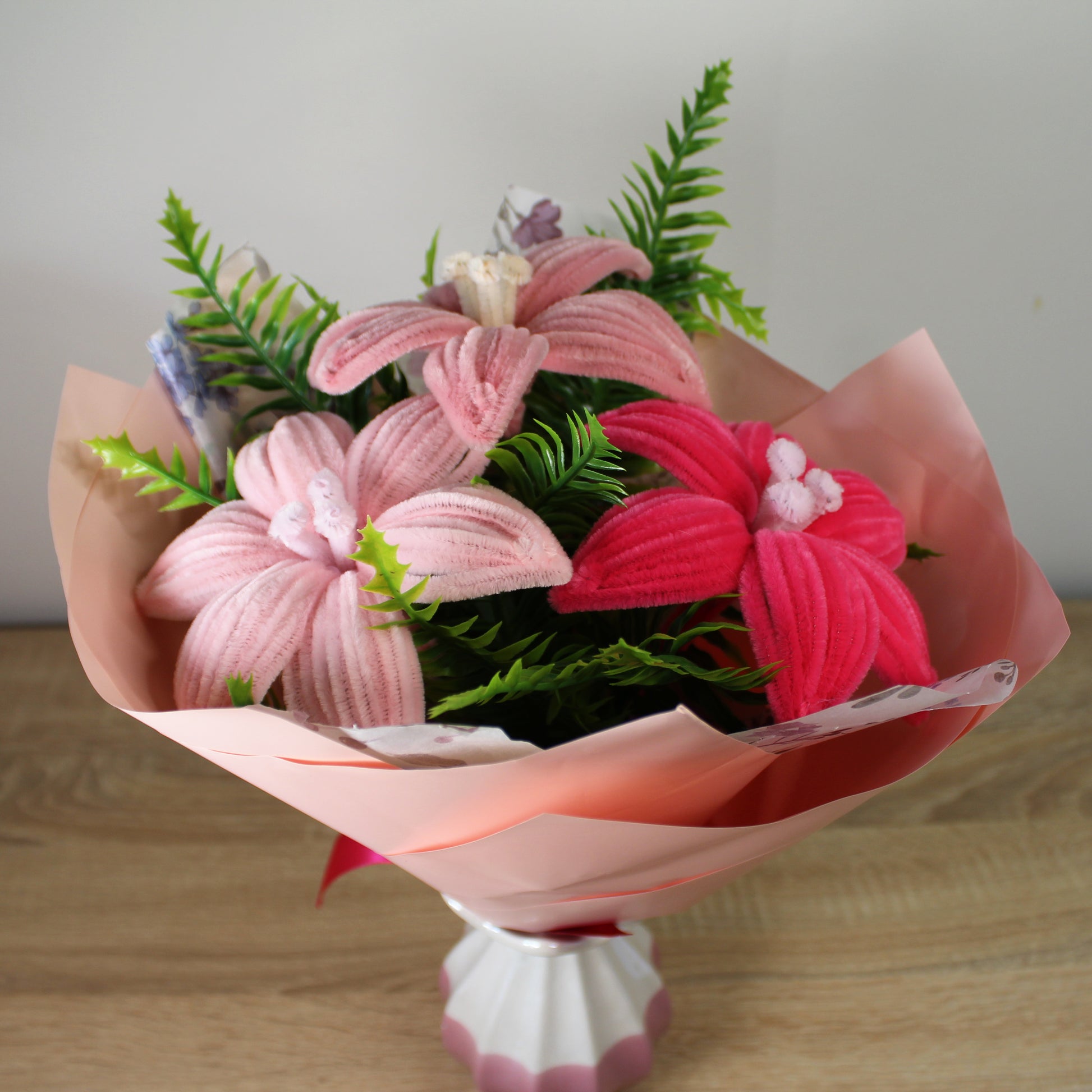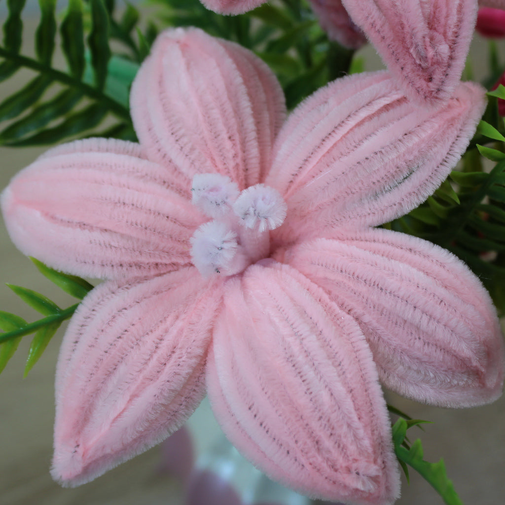 Handmade kytice lilie z žinylkových drátků, která rozzáří váš domov a udělá radost všem, co milují květiny, nebo ocení ruční práci. Chcete darovat květinu, ale bojíte se že nevydrží bez vody, dlouhý převoz autem, horko a nebo naopak mráz? Tak s touhle kyticí se bát nemusíte.