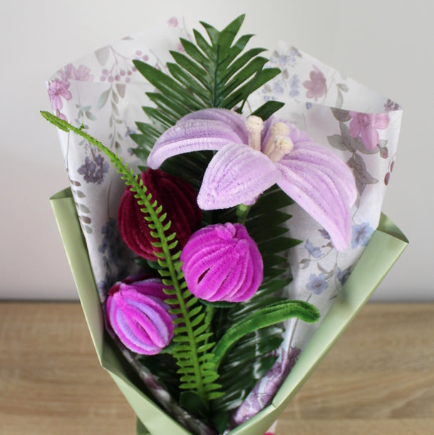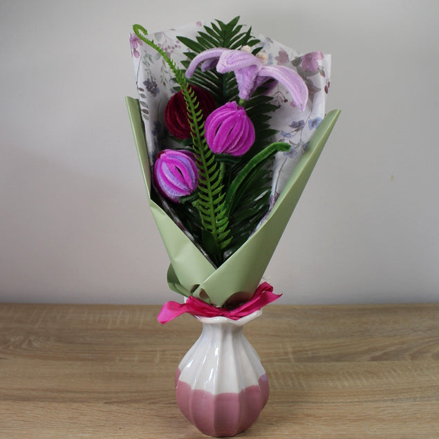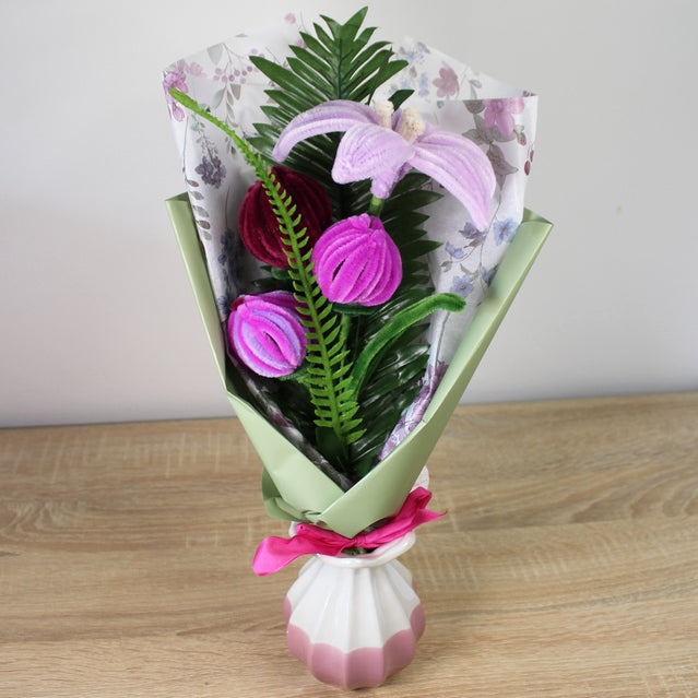 Handmade kytice z žinylkových drátků, která rozzáří váš domov a udělá radost všem, co milují květiny, nebo ocení ruční práci. Kytice má imitovat tři tulipány a jednu lilii. Chcete darovat květinu, ale bojíte se že nevydrží bez vody, dlouhý převoz autem, horko a nebo naopak mráz? Tak s touhle kyticí se bát nemusíte.