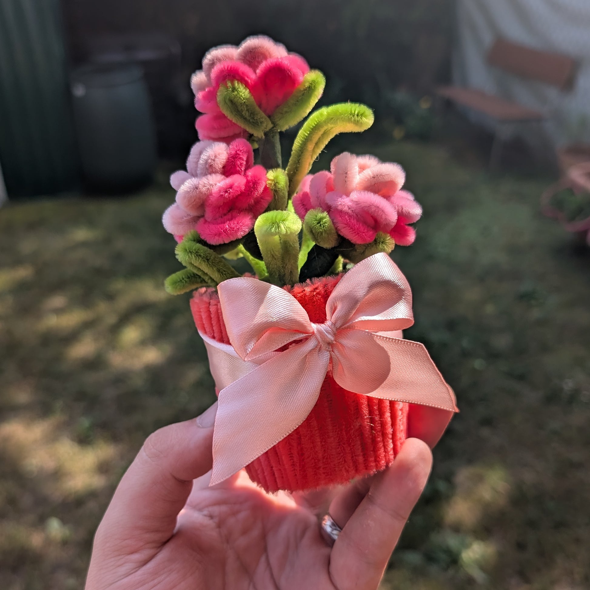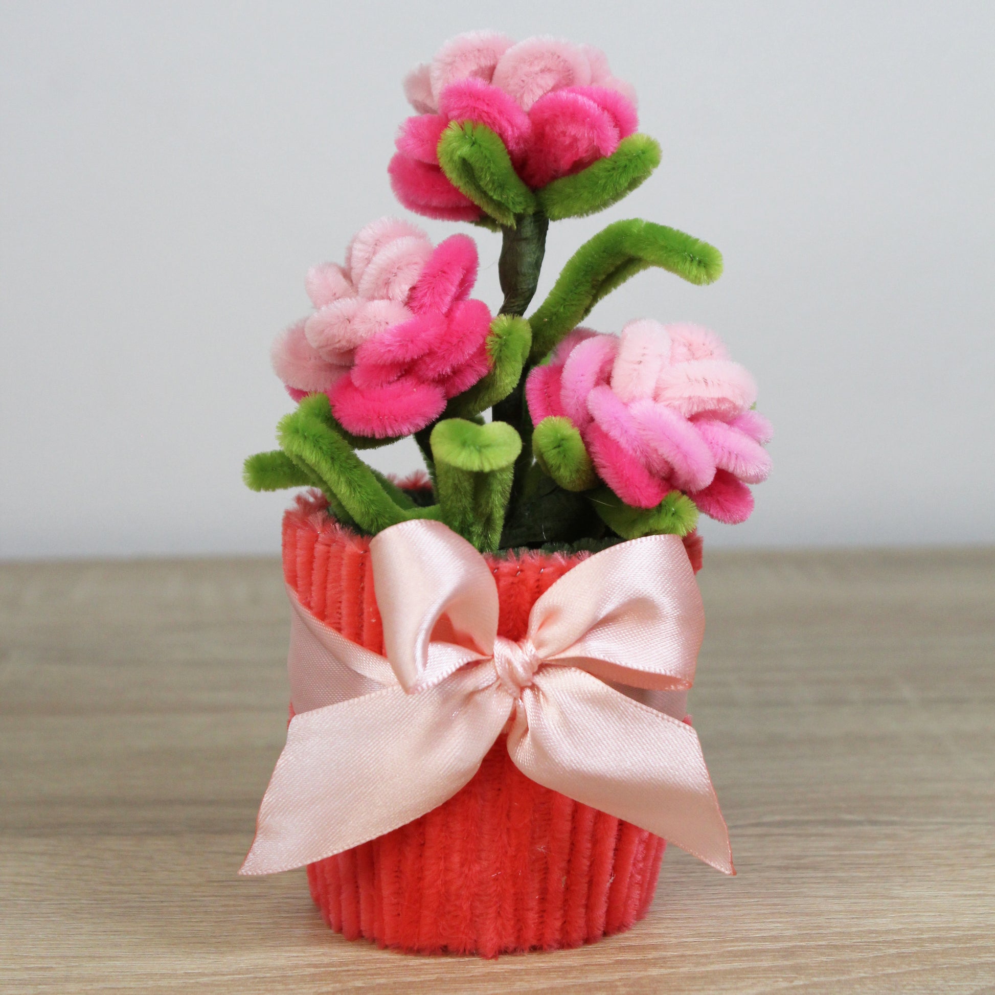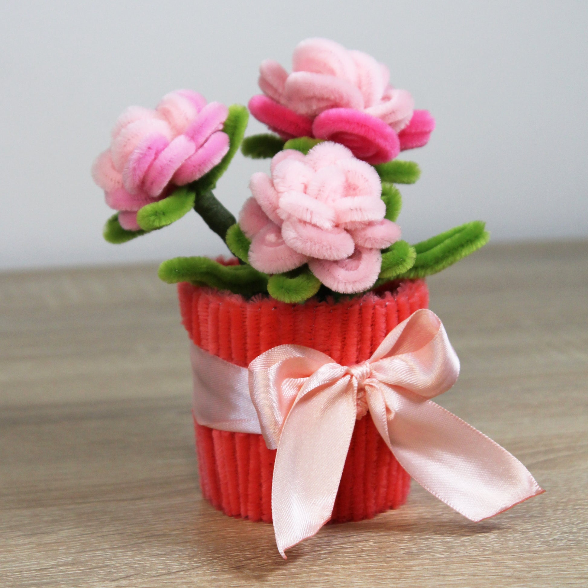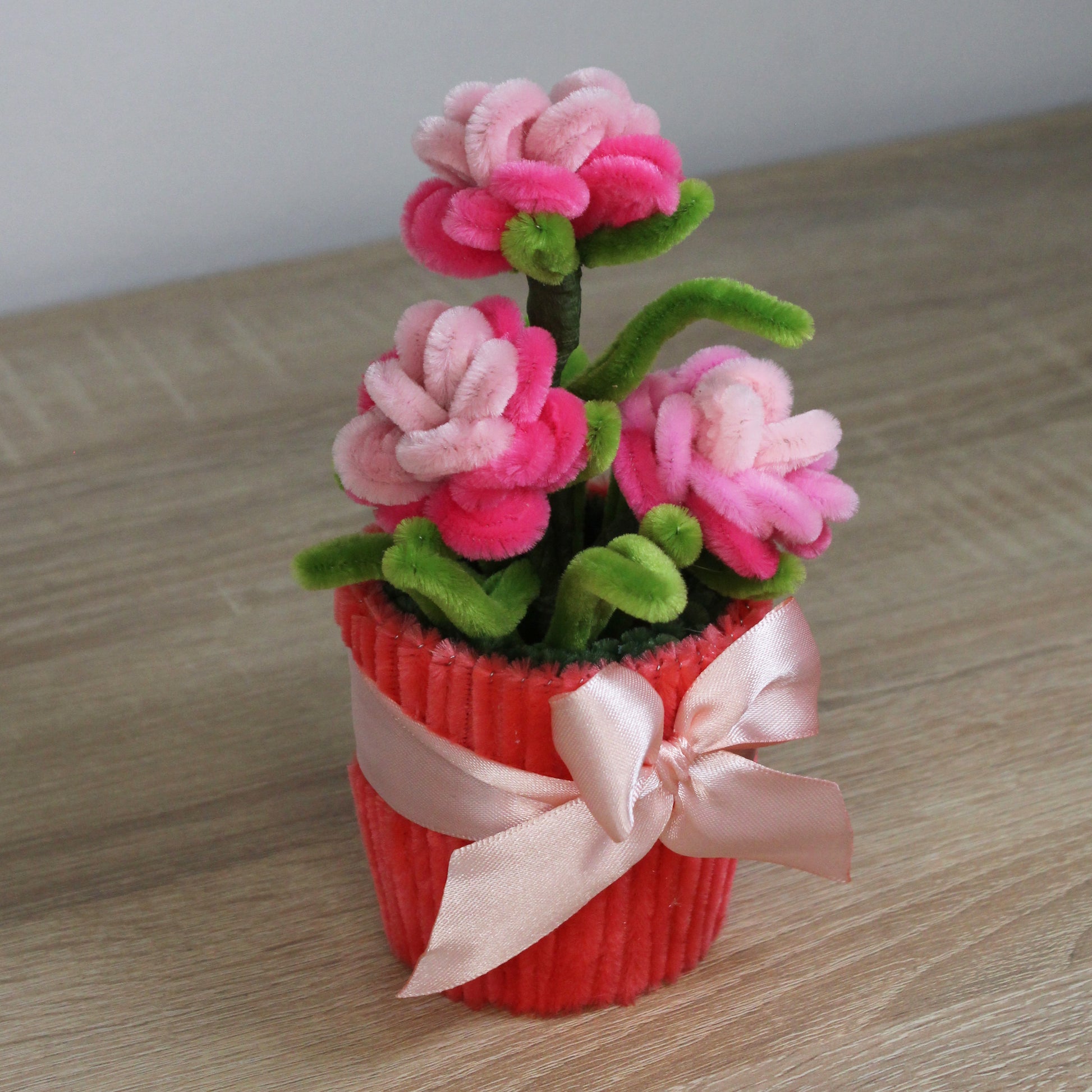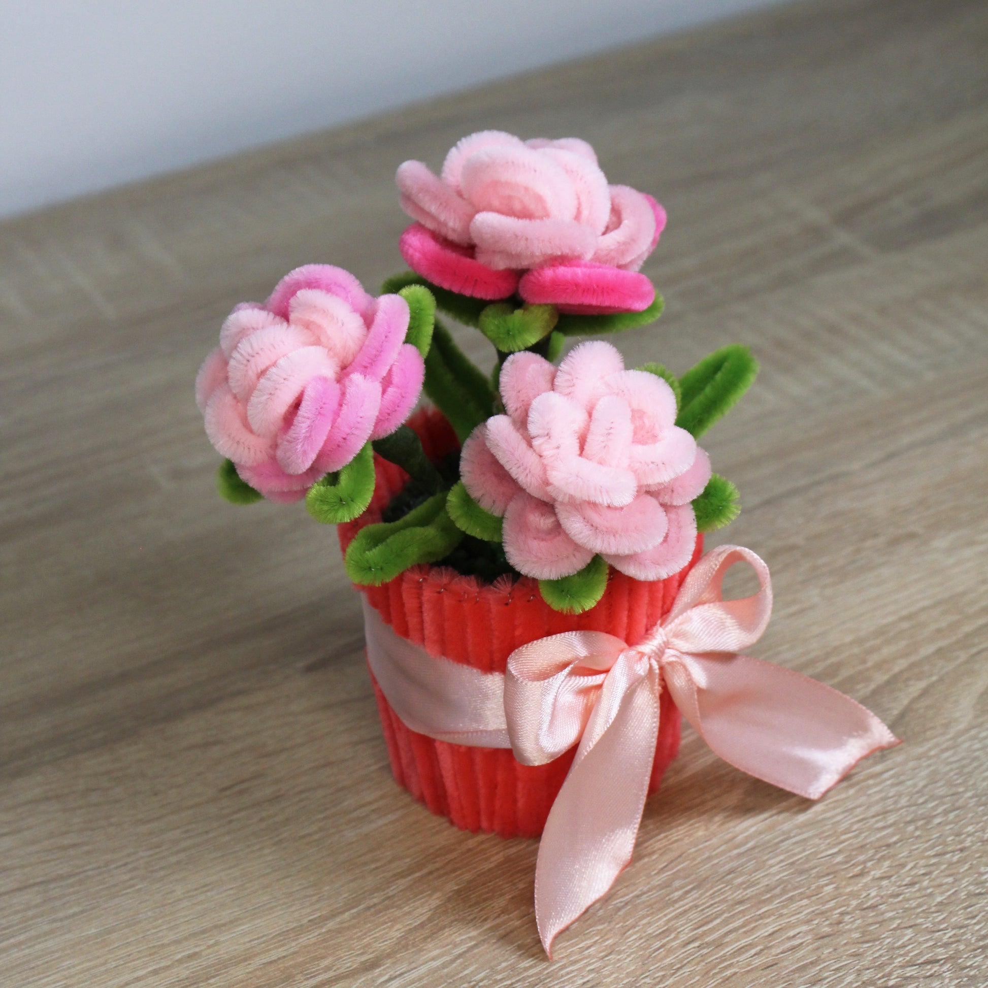 Roztomilá rostlina v květináči vyrobená z žinylkových drátků. Rostlina napodobuje trsovou růži složenou ze tří okrasných květů. Potěší jako nevšední dárek k celé řadě příležitostí. Dárek pro maminku, přítelkyni, sestru, kolegyni, babičku a nebo třeba paní učitelku...