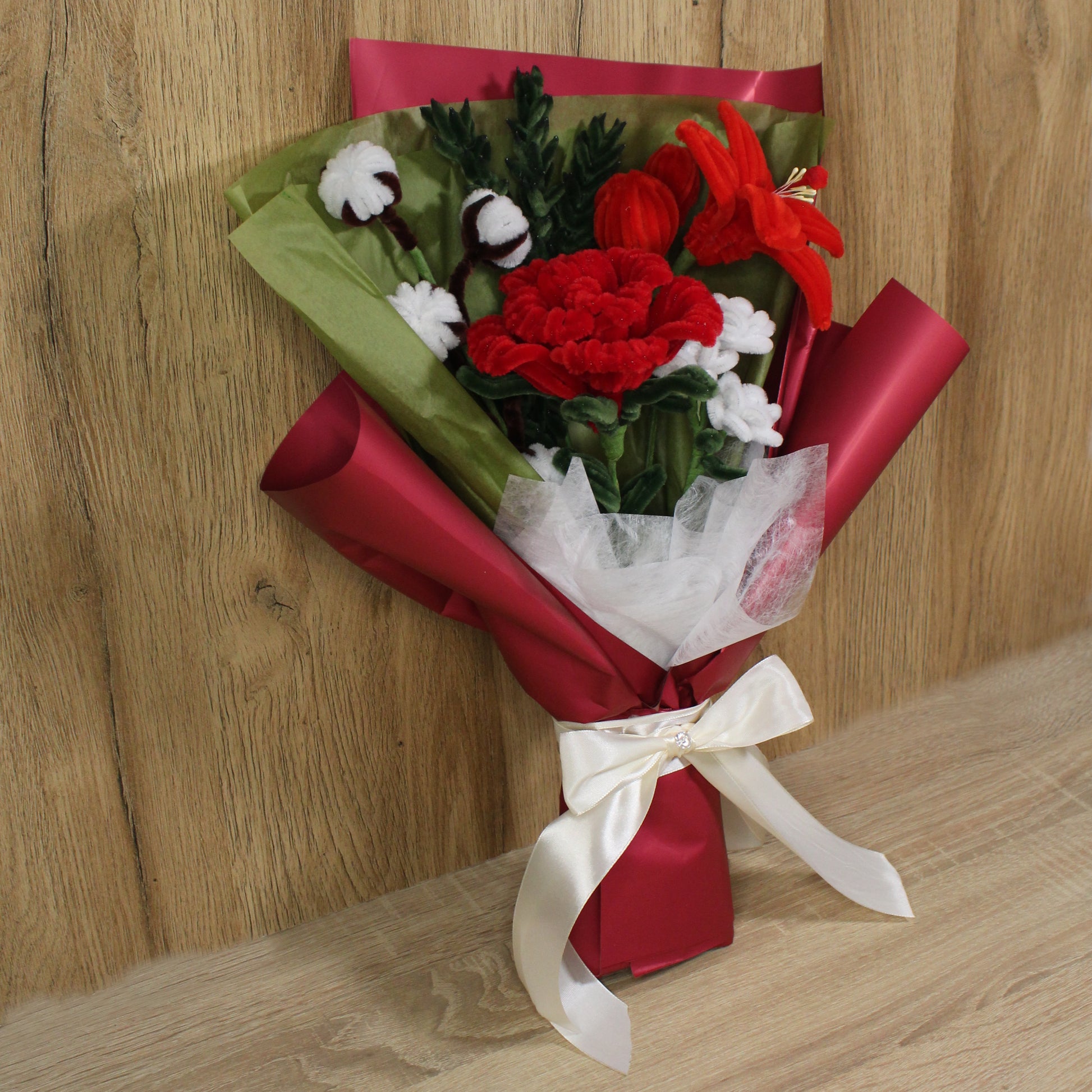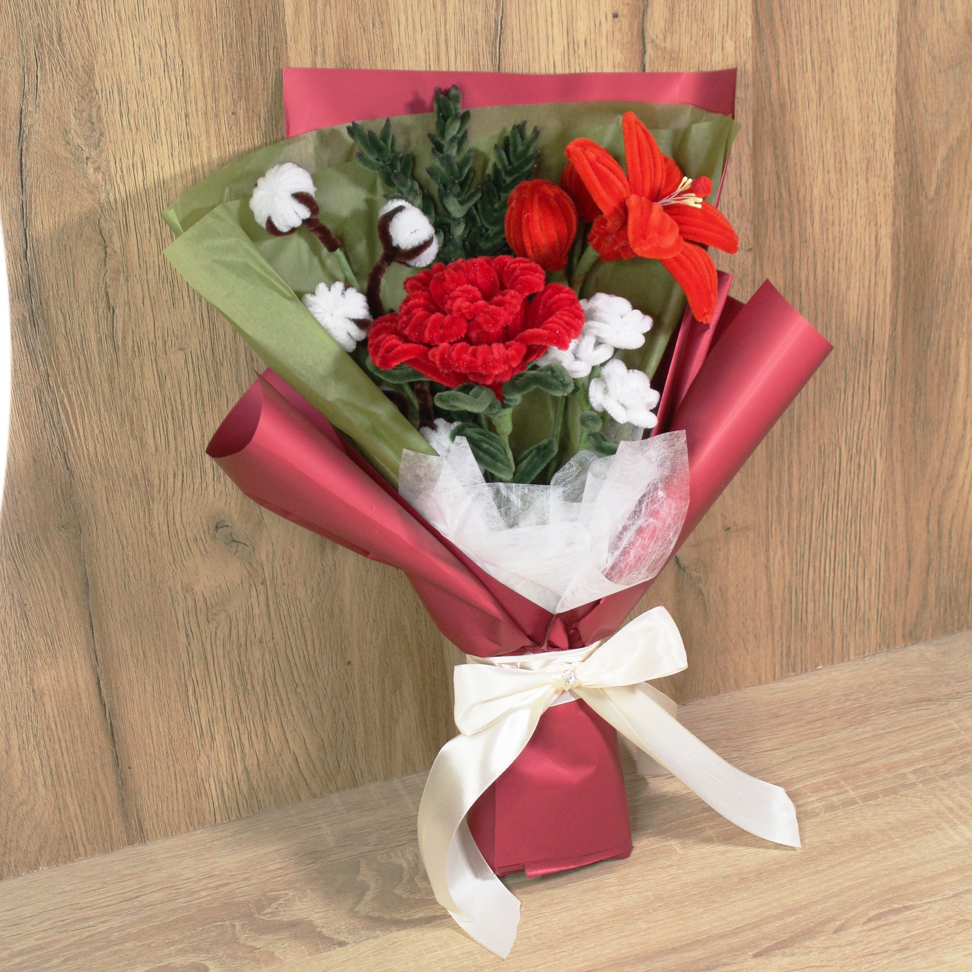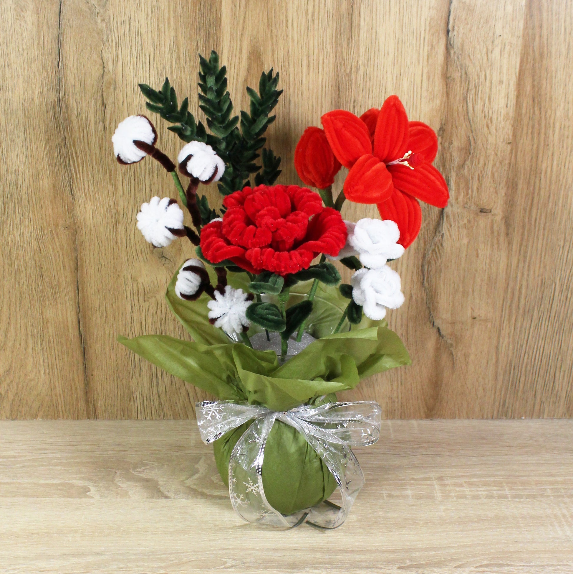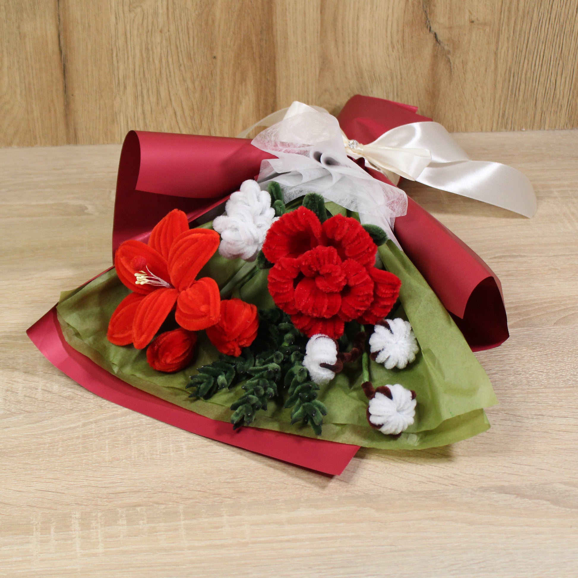 Ručně vyráběná kytice z chlupatých drátků. Kytice se skládá z imitace květů amarylisu, růže, trsové růže, bavlníku a smrkové větvičky. Kytice nepotřebuje žádnou péči, teplo, chlad, voda nebo dlouhý transport Vás s touto kyticí trápit nemusí. Součástí kytice je její dárkové zabalení, tedy okrasná manžeta z celofánu, hedvábných papírů a stuhy. Vkusná dlouhotrvající dekorace ideální jako nevšední dárek.